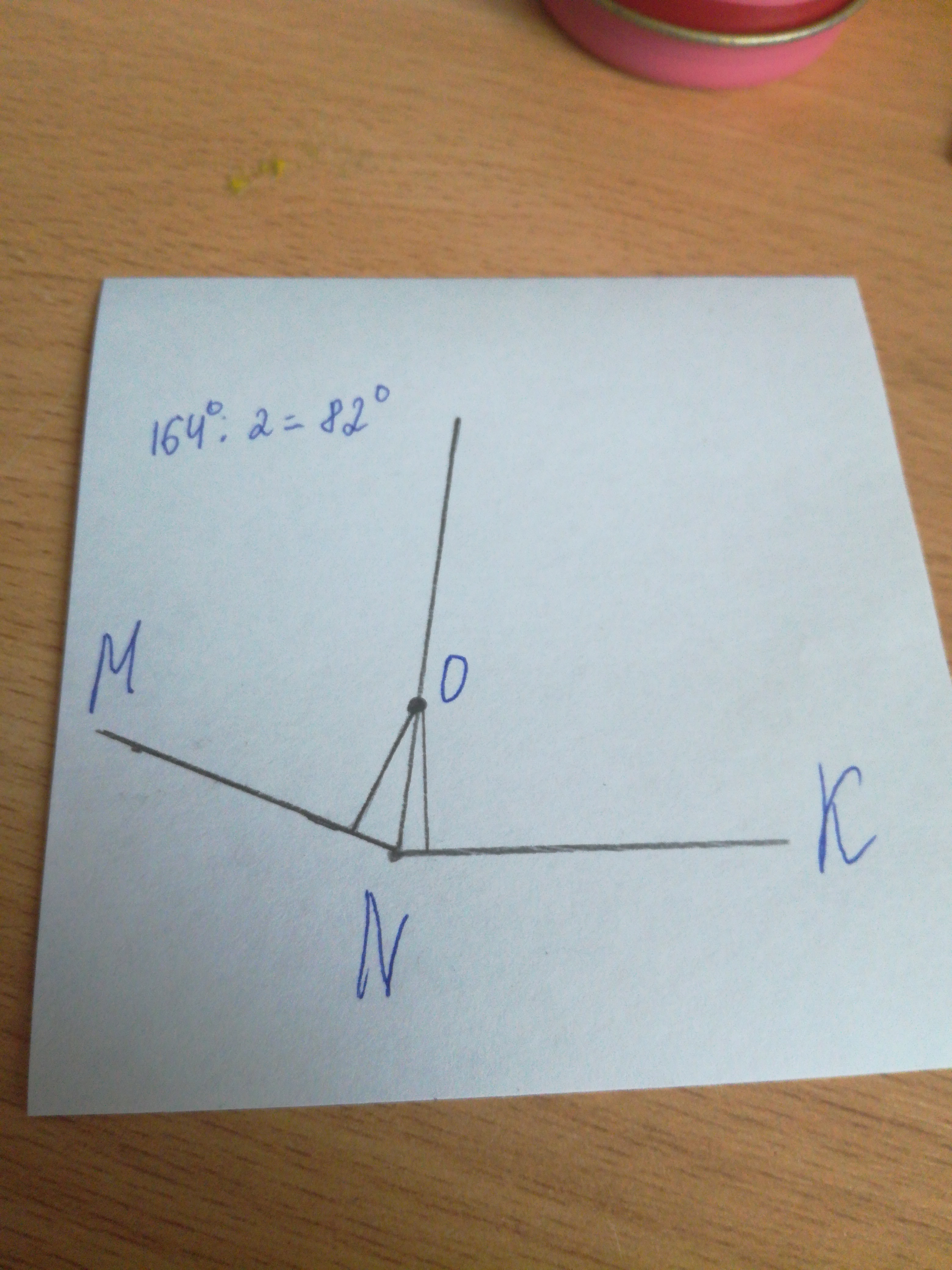НАЧЕРТИТЕ УГОЛ MNK РАВНЫЙ 164 ГРАДУСАМ ПРОВЕДИТЕ БЕССЕКТРИСУ ЭТОГО УГЛА ОТМЕТЬТЕ НА НЕЙ ТОЧКУ O И ПРОВЕДИТЕ ЧЕРЕЗ НЕЁ ПРЯМЫЕ ПЕРПЕНДИКУЛЯРНЫЕ СТОРОНАМ УГЛА mnk