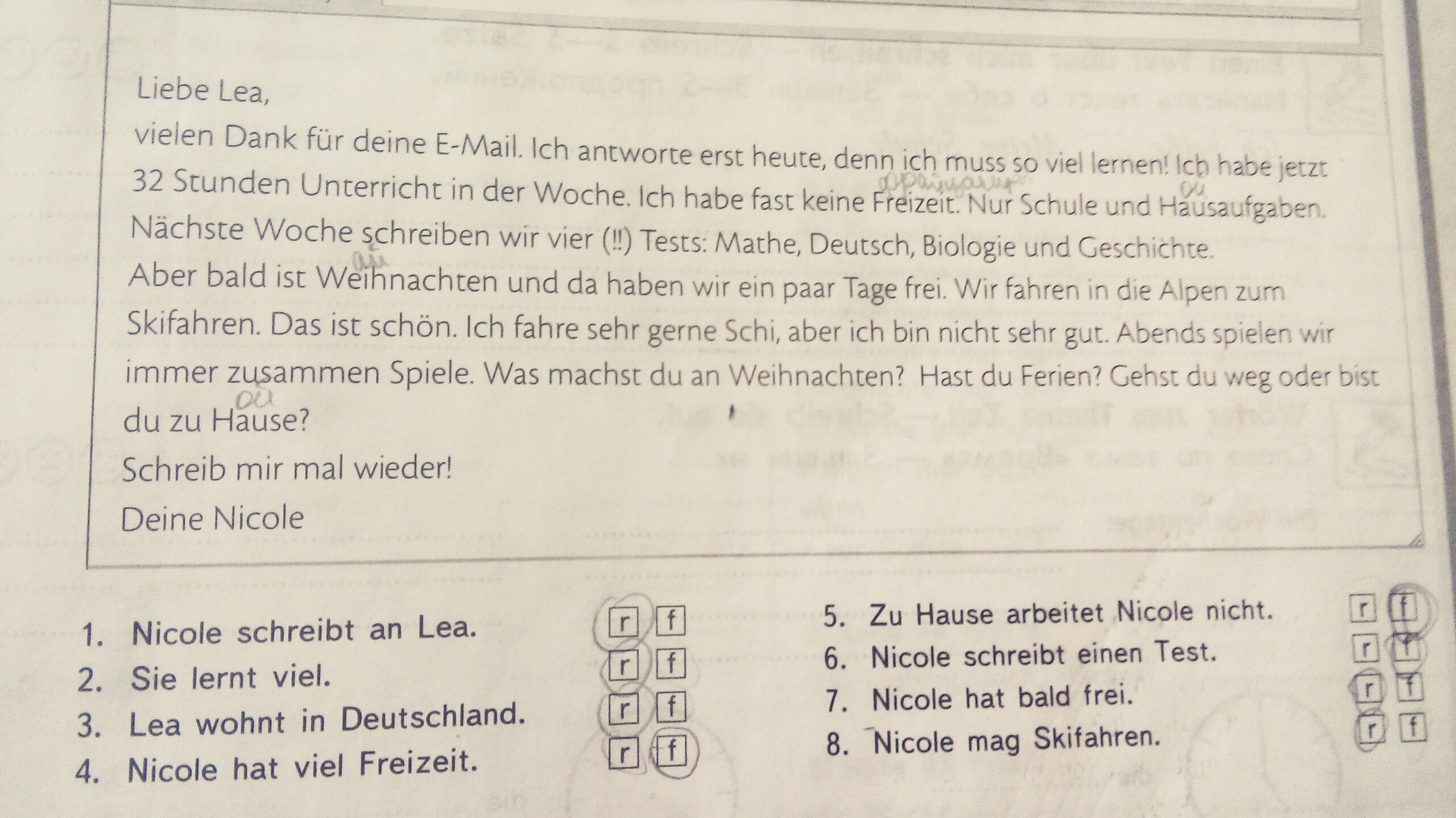 большое спасибо за твой е-майл. Я отвечаю только сейчас,потому что должна так много учить! Сейчас у меня на неделе 32 часа занятий. У меня почти нет свободного времени. Только школа и домашние задания. На следующей неделе мы пишем 4 теста: по математике,немецкому,биологии и истории. Но скоро Рождество и тогда на пару дней мы освободимся. Мы поедем в Альпы,кататься на лыжах. Это прекрасно. Я очень люблю кататься на лыжах,хоть и не очень хоршо это делаю. Вечерами мы всегда вместе играем в игры. Что делаешь на Рождество ты? Есть ли у тебя каникулы? Уедешь ли или останешься дома?