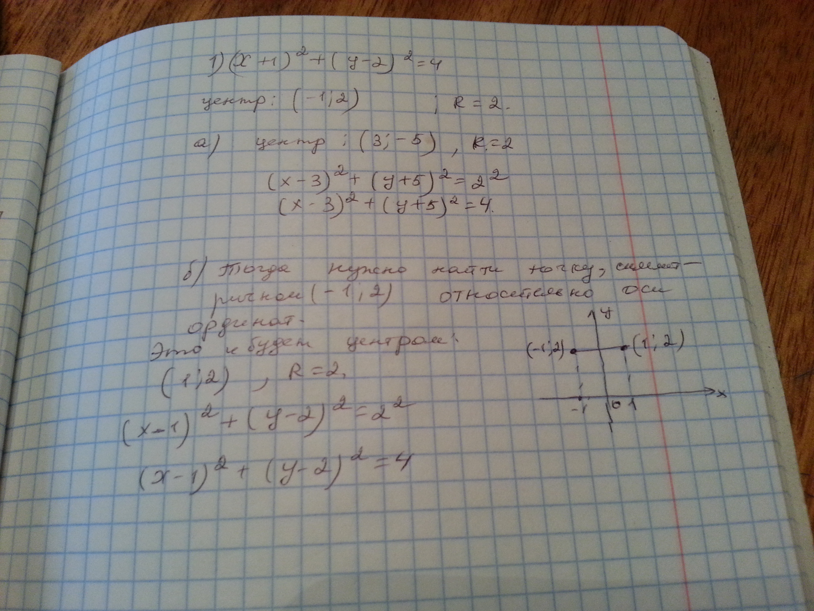Дана окружность (x+1)^2+(y-2)^2=4. Составьте уравнение окружности: а) равной данной, центр которой находится в точке (3; -5); б) симметричной данной относительно оси ординат.