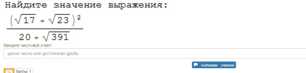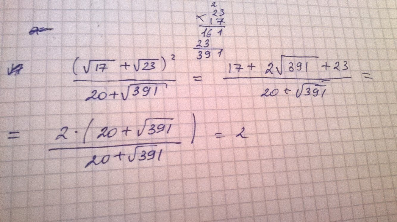 =[tex]17+2 sqrt{ 391}+23/20+sqrt{391}=40+2sqrt{391}/20+sqrt{391}=2(20+sqrt{391})/20+sqrt{391}=2