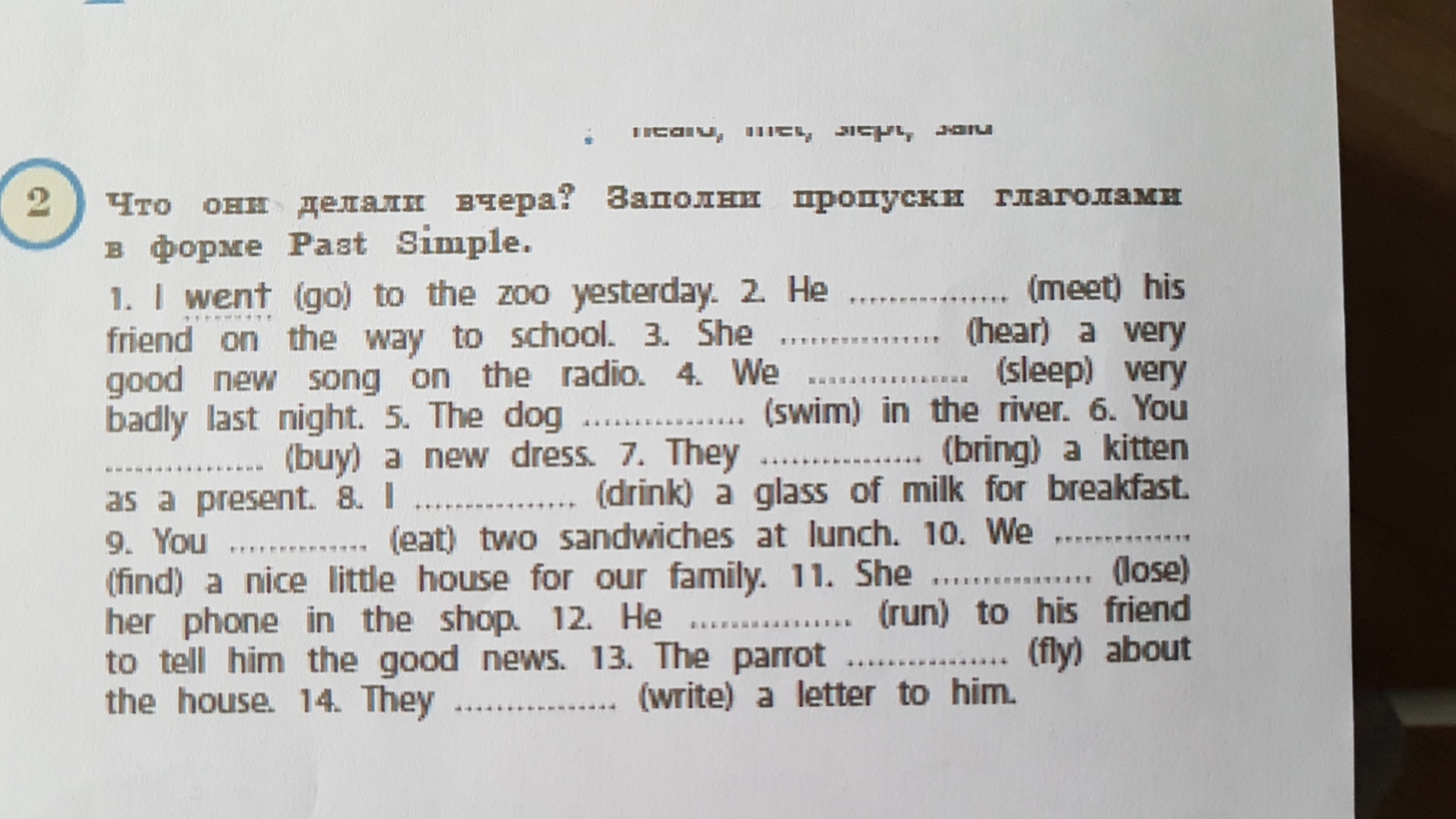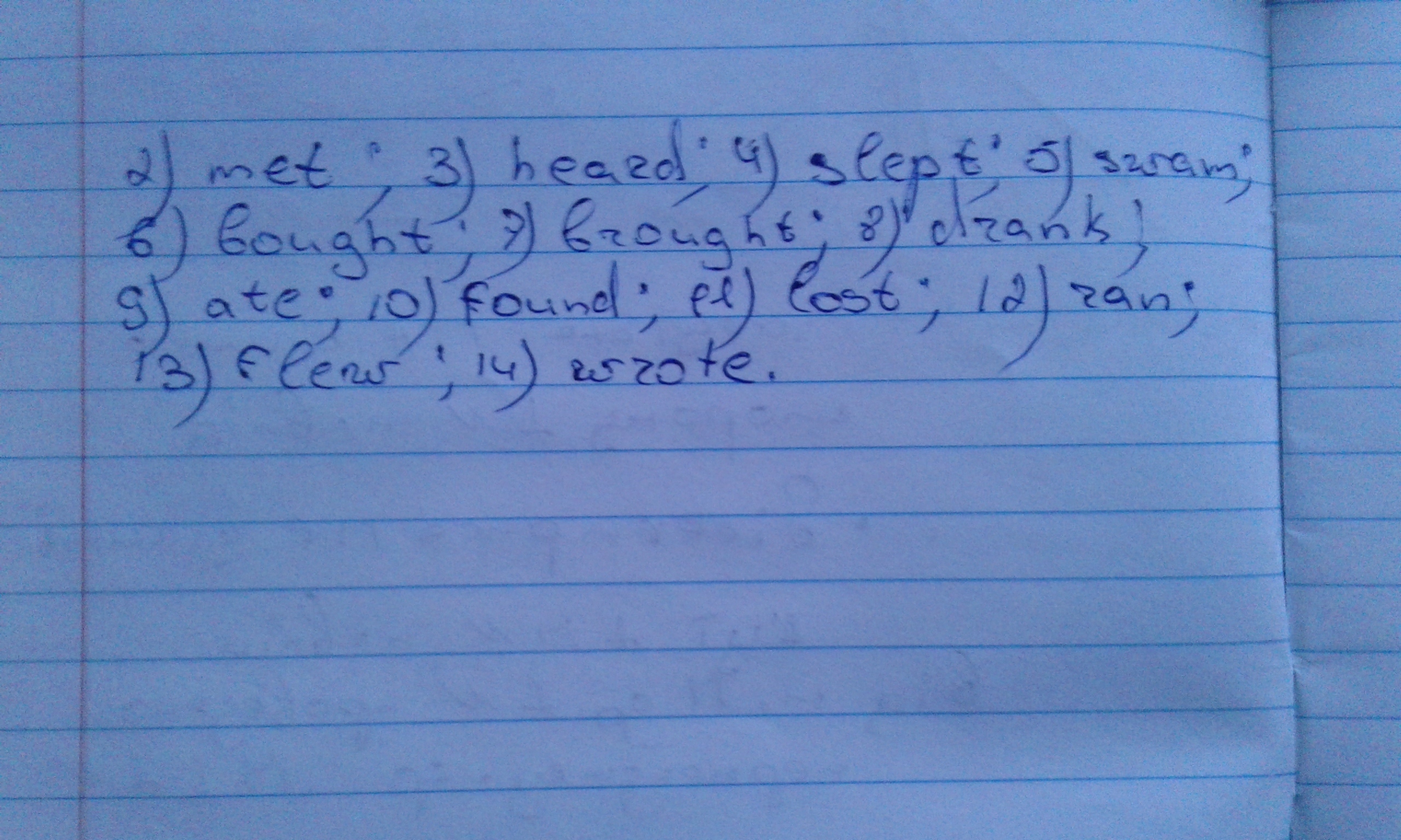 2) met 3) heard 4) slept 5) swimmed 6) bought 7) brought 8) drank 9) ate 10) found 11) lost 12) ran 13) flied 14 ) wrote