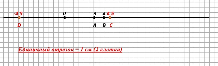 Начертите координатную прямую и отметьте на ней точки A(3), B(4), C(4,5),D(-4,5). Какие из отмеченных точек имеют противоположные координаты?