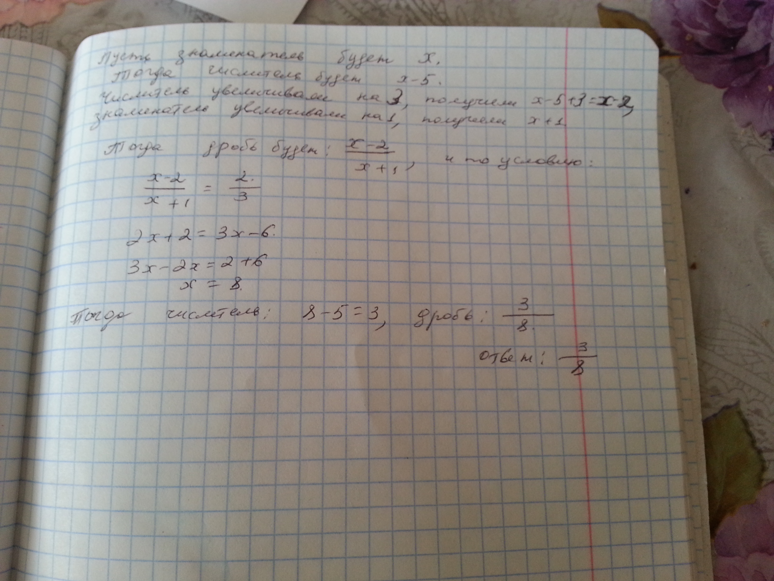 ЗНАМЕНАТЕЛЬ ДАННОЙ ДРОБИ НА 5 БОЛЬШЕ ЕГО ЧИСЛИТЕЛЯ. ЕСЛИ ЧИСЛИТЕЛЬ УВЕЛИЧИТЬ НА 3, А ЗНАМЕНАТЕЛЬ НА 1, ТО ПОЛУЧИТСЯ ДРОБЬ