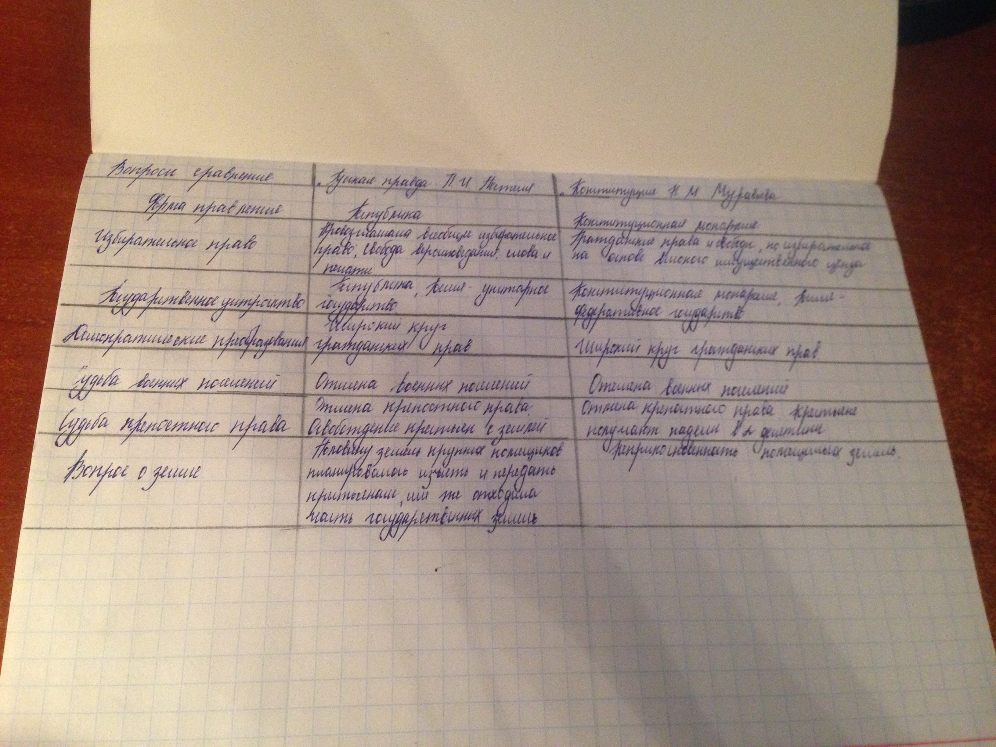 письменно сравнить Русскую правду Пестеля и Конституцию Муравьева-Апостола по следующим параметрам: крепостное право, сословия, государсвенное устройство, демократические права, форма правления и избирательное право