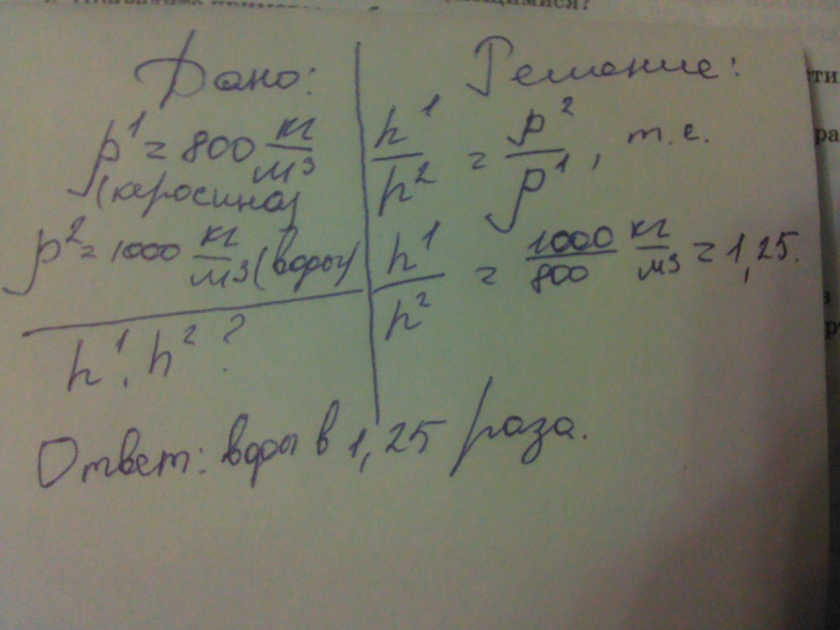сообщающиеся сосуды в 1 колено налита вода а в другой керосин какая жидкость будет выше и Почему плотность керосина 800 килограмм на метр в кубе