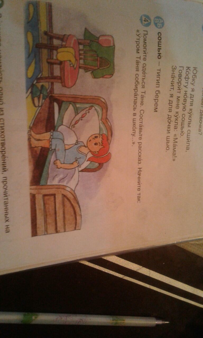 Комната просторная и светлая. Девочка десяти лет сидит на кровати. Стоит стул, на котором висит ее одежда. Кровать еще не заправлена и помята. По-видимому, девочка только что встала и будет собираться в школу. Вид у нее озадаченный, ей надо готовиться идти в школу, а она еще и не умывалась, и не завтракала....