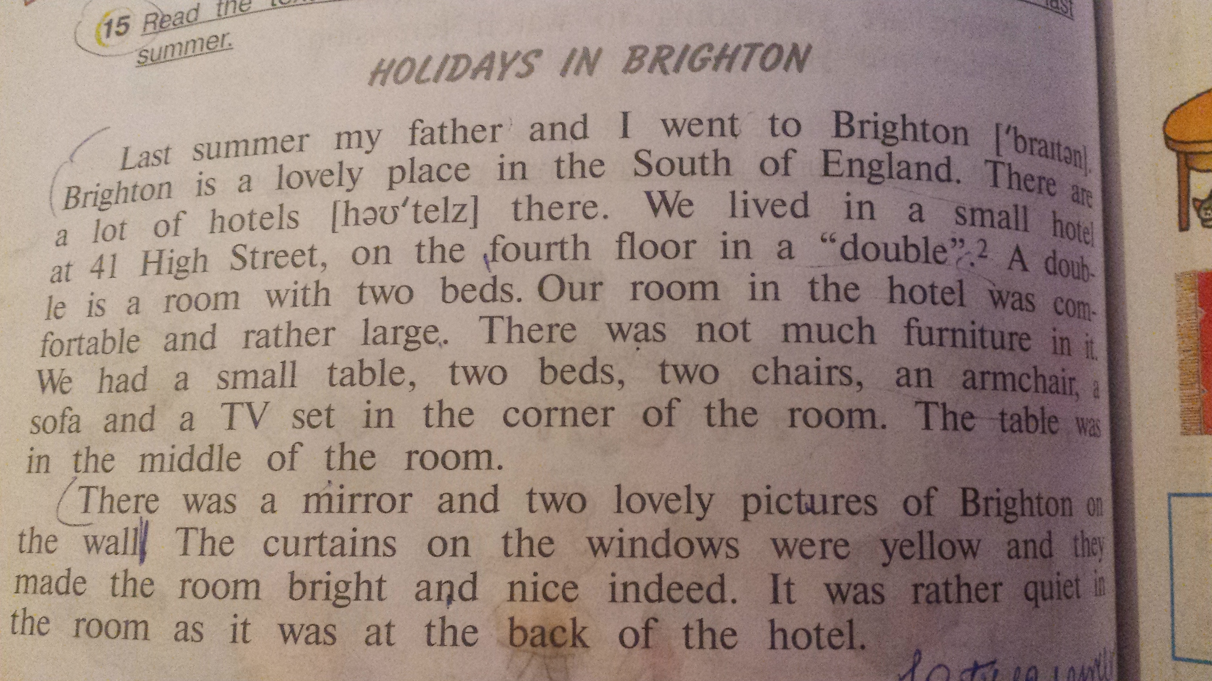Прошлым летом мой папа и я были в Брайтоне. Брайтон это прекрасное место в Южной Англии. Там много отелей. Мы жили в маленьком отеле на 41 High Street, на 4-ом этаже в номере для двоих. Это номер с двумя кроватями. Наша комната в отеле была удобная и довольно большая. В ней не много мебели. Там был маленький стол, две кровати, два стула, кресло, диван и в углу комнаты стоял телевизор. Стол стоял в середине комнаты.