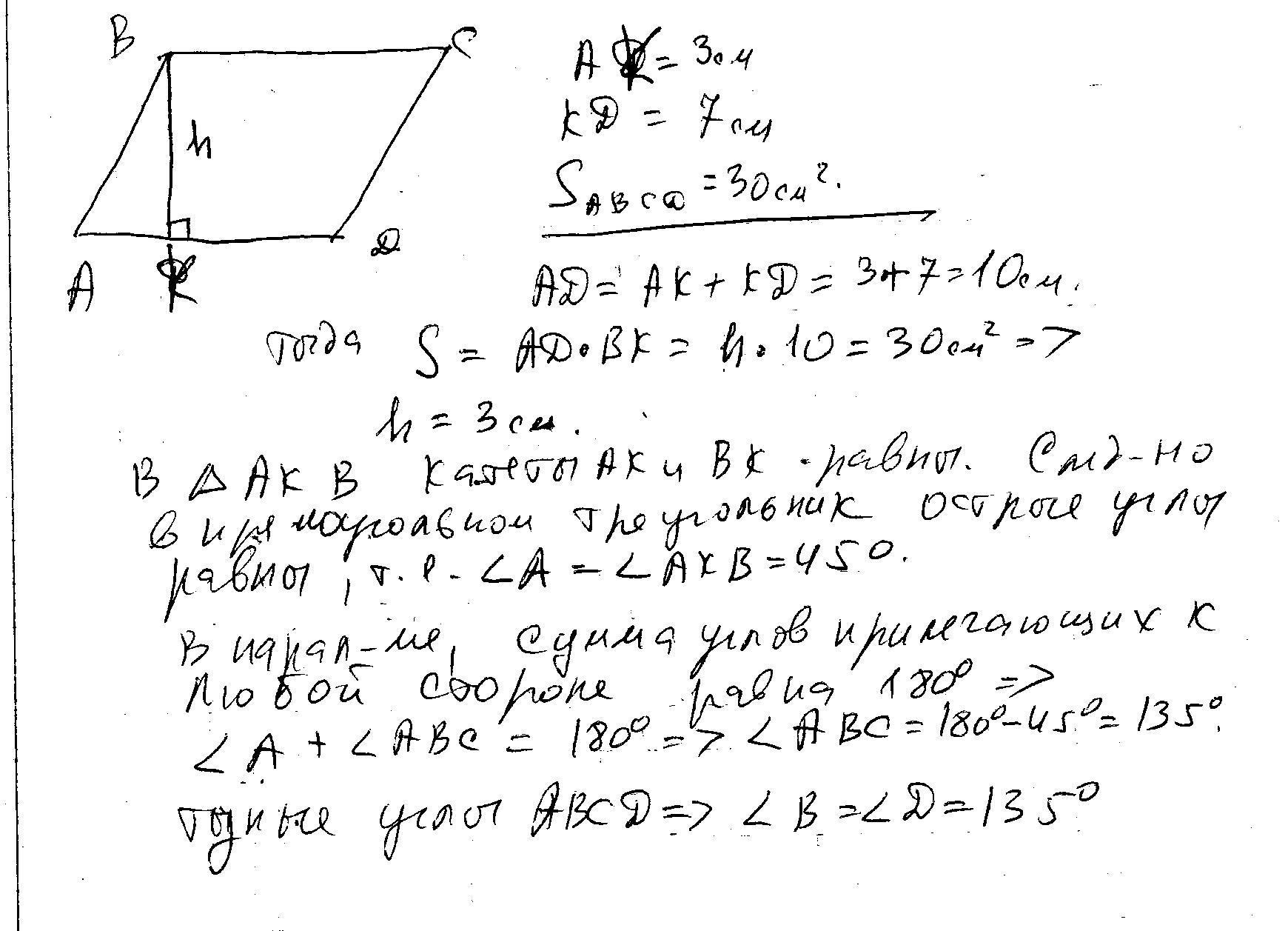 Найдите тупой угол параллелограмма, если его площадь равна 30см^2, высота, проведённая из вершины тупого угла, делит сторону на отрезки 3 см и 7 см, считая от вершины острого угла.