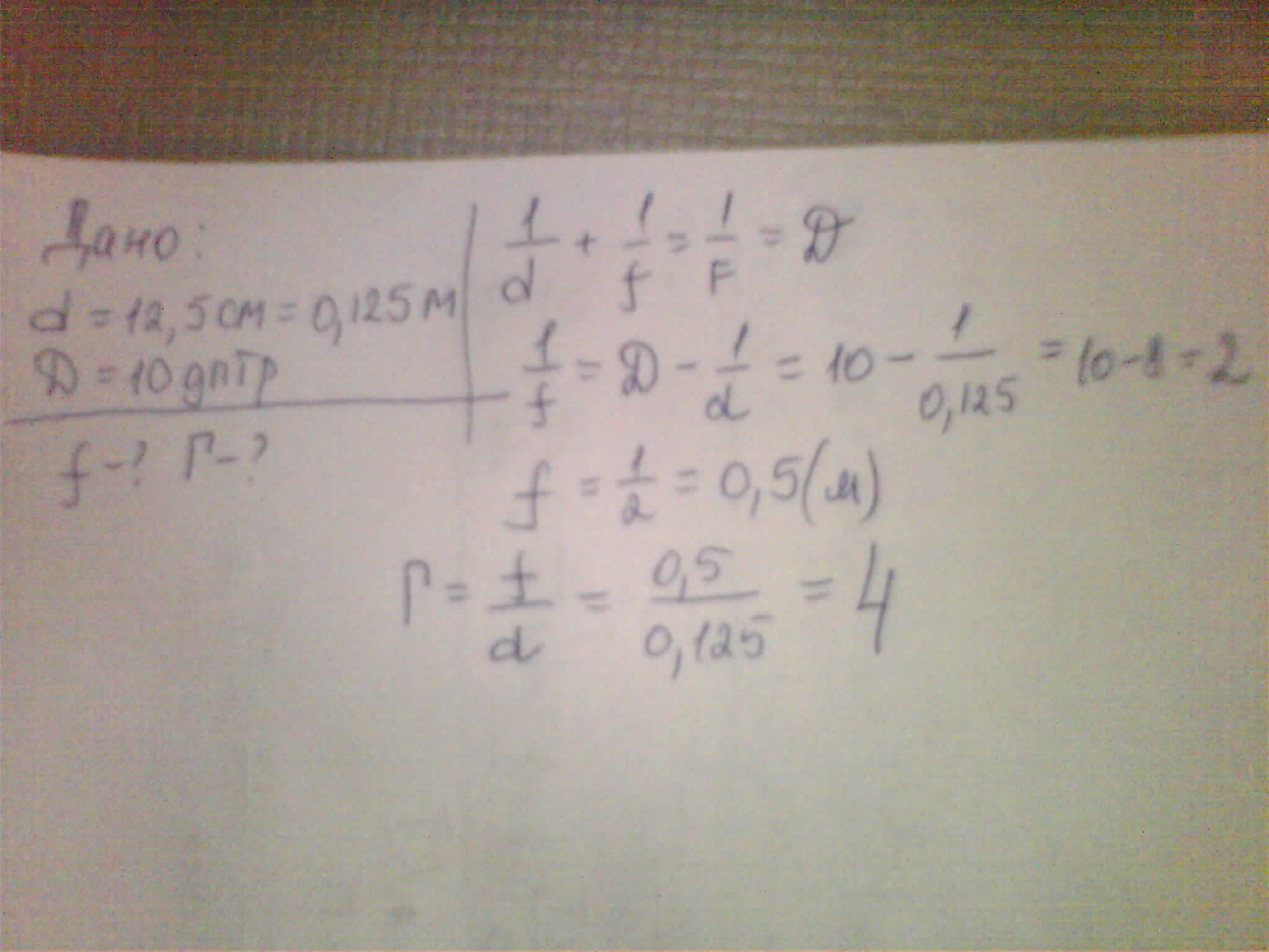Свеча находится на расстоянии 12,5 см от собирающей линзы, оптическая сила которая равна 10 дптр. На каком расстоянии от линзы получится изображение и каким оно будет? (решение.)