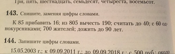 К восьмидесяти пяти прибавить шестнадцать; из восьмисот вычесть сто девяносто; считать до сорока; с шестьюдесятью однокурсниками; семьсот жителей; дожить до девяноста лет.