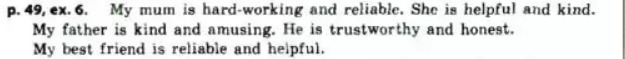 Моя мама трудолюбивая и надежная.Она готова протянуть руку помощи и добрая.Мой отец добрый и юморной(забавный).Он верный( ему можно доверять) и честный .Мой друг надежный ,готов прийдти на помощь .