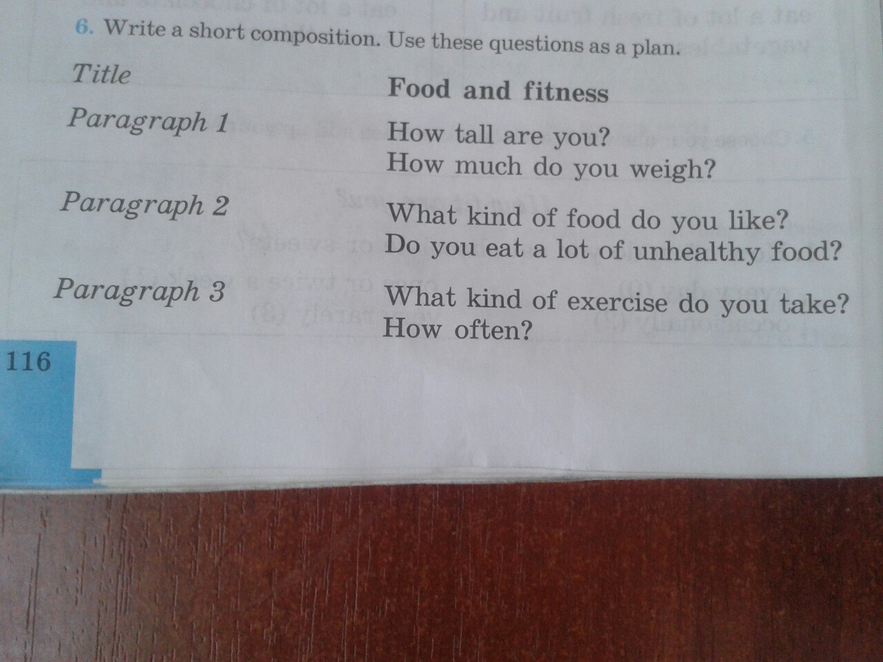 Hi! My mame is ..... and I love do fitness! My tall is .... and my weight. ... I eat a lot of vegetables , but rarely eat unhealthy food) Every morning I do sport, and a lot of exercise