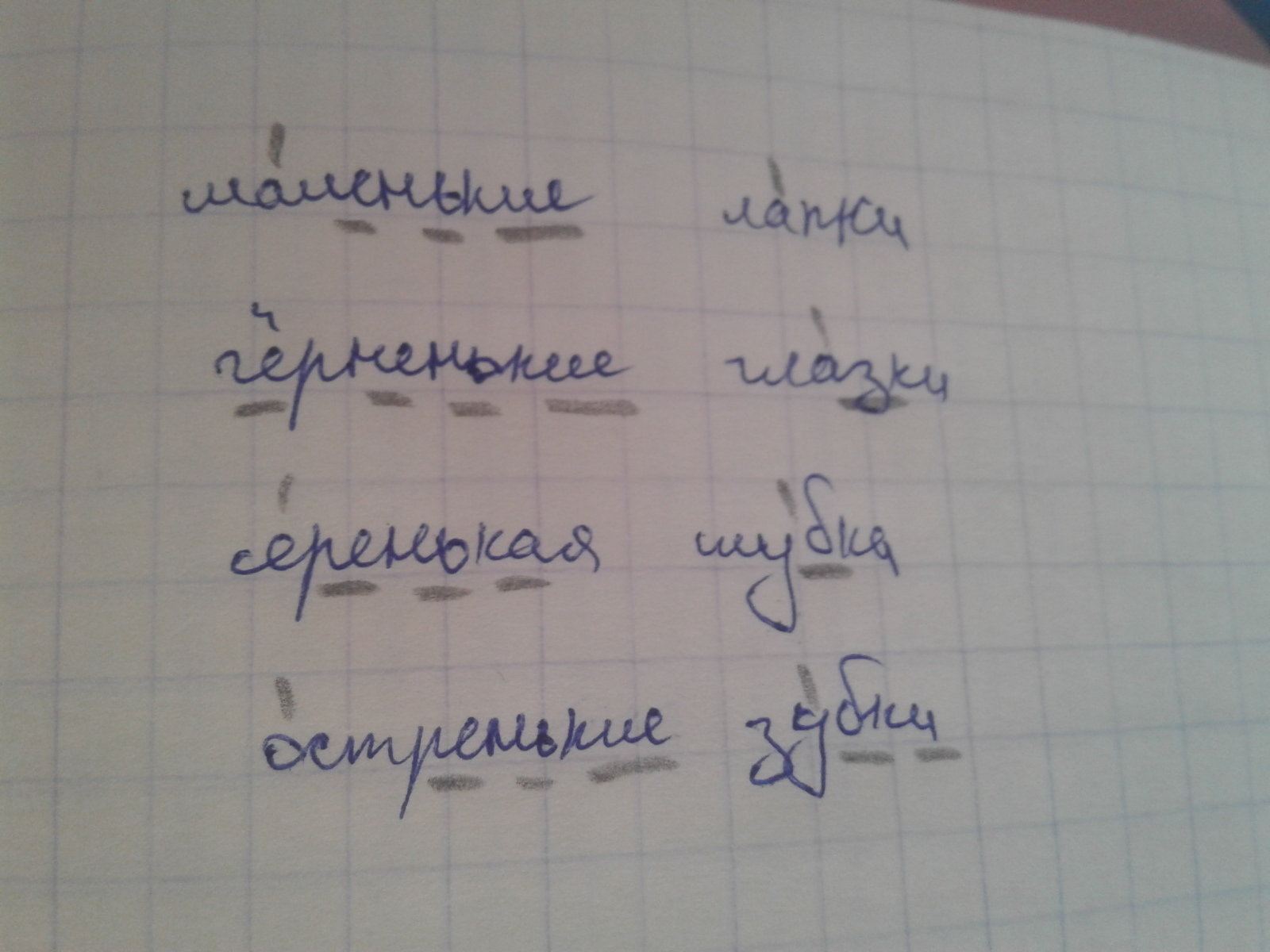 Надо во всех словах выделить орфограмму .маленькие лапки, черненькие глазки, серенькая шубка,остренькие зубки.
