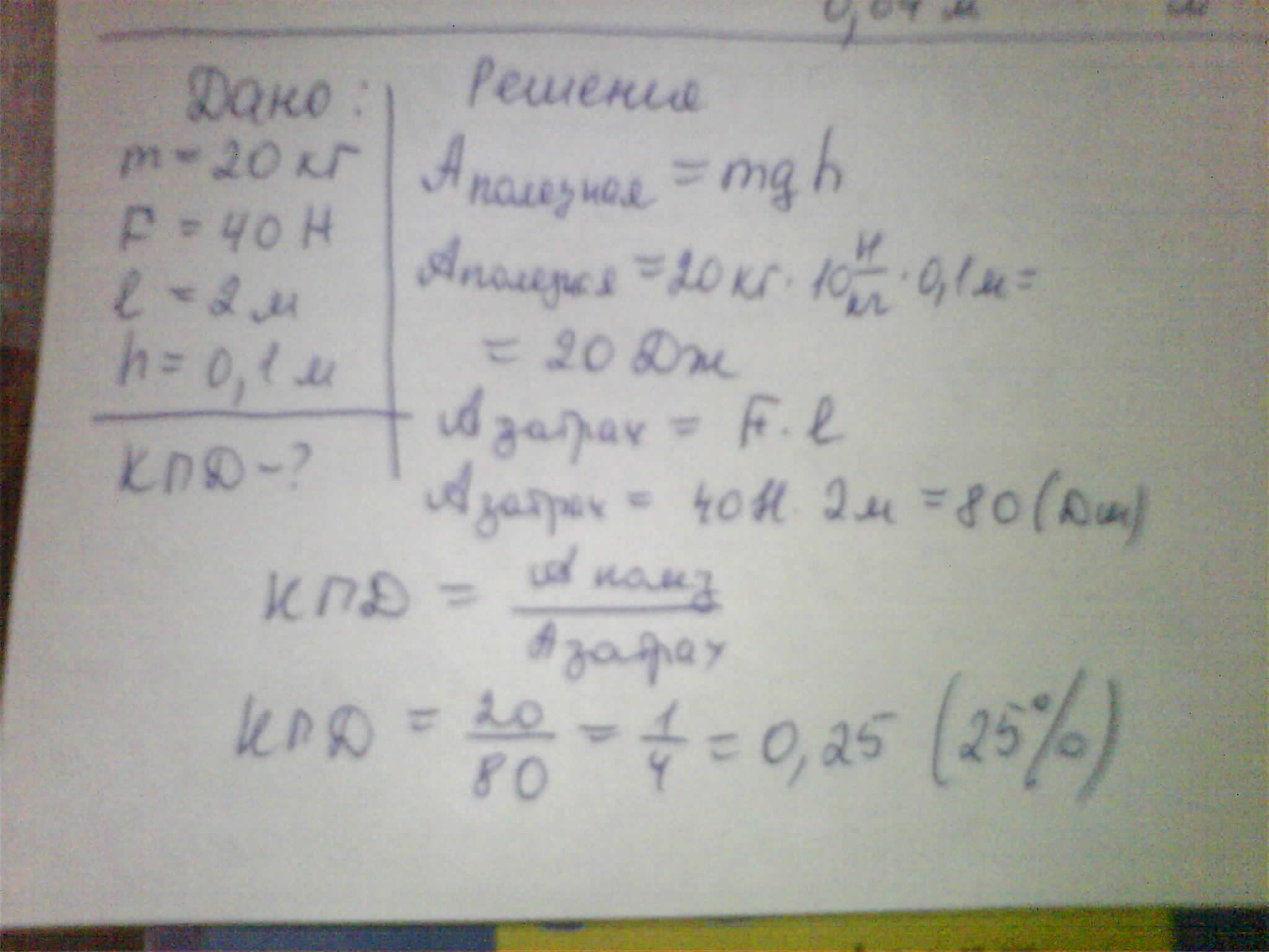 КПД = (200 Н/40 Н) * 0.05 = 0.25 = 25%