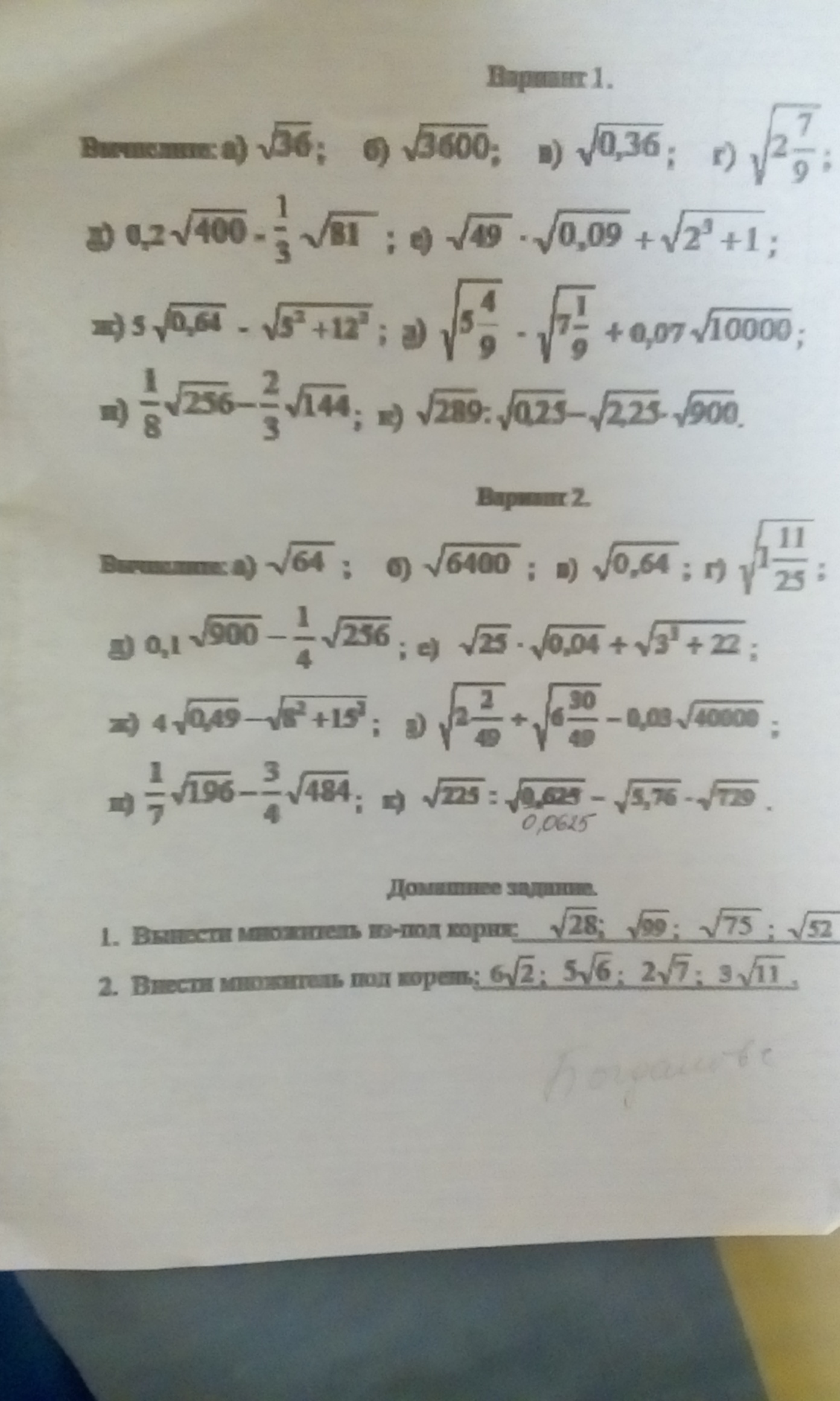 Вычислите. а) √36 б) √3600 в) √0,36 г) √2 целых, 7/9