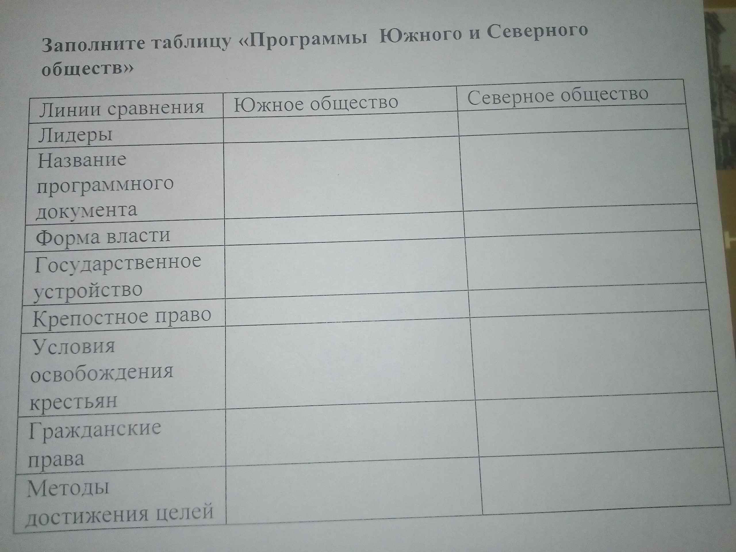 Южное общество-Лидер: П.И.Пестель.П. И. Пестель разработал конституционный проект, который был назван в память о древнерусских законах "Русская правда".- название програмного документа. Это был первый в истории России цельный проект республиканской конституции. Россия провозглашалась республикой. Гос. управление основывалось на разделении властей. Законодательная власть принадлежала парламенту, состоящему из одной палаты - Народное вече. Исполнительная власть принадлежала Державной Думе. Крепостное право нужно отменить и ликвидировать сословное деление. Характер:Тайное общество вооруженное выступлениями при смене императора на престоле.Цели:1Установление республики. 2Отмена крепостного права. 3Разделение всех земель на общественные и частные.4 Уничтожение сословий. 6Провозглашение гражданских счвобод.