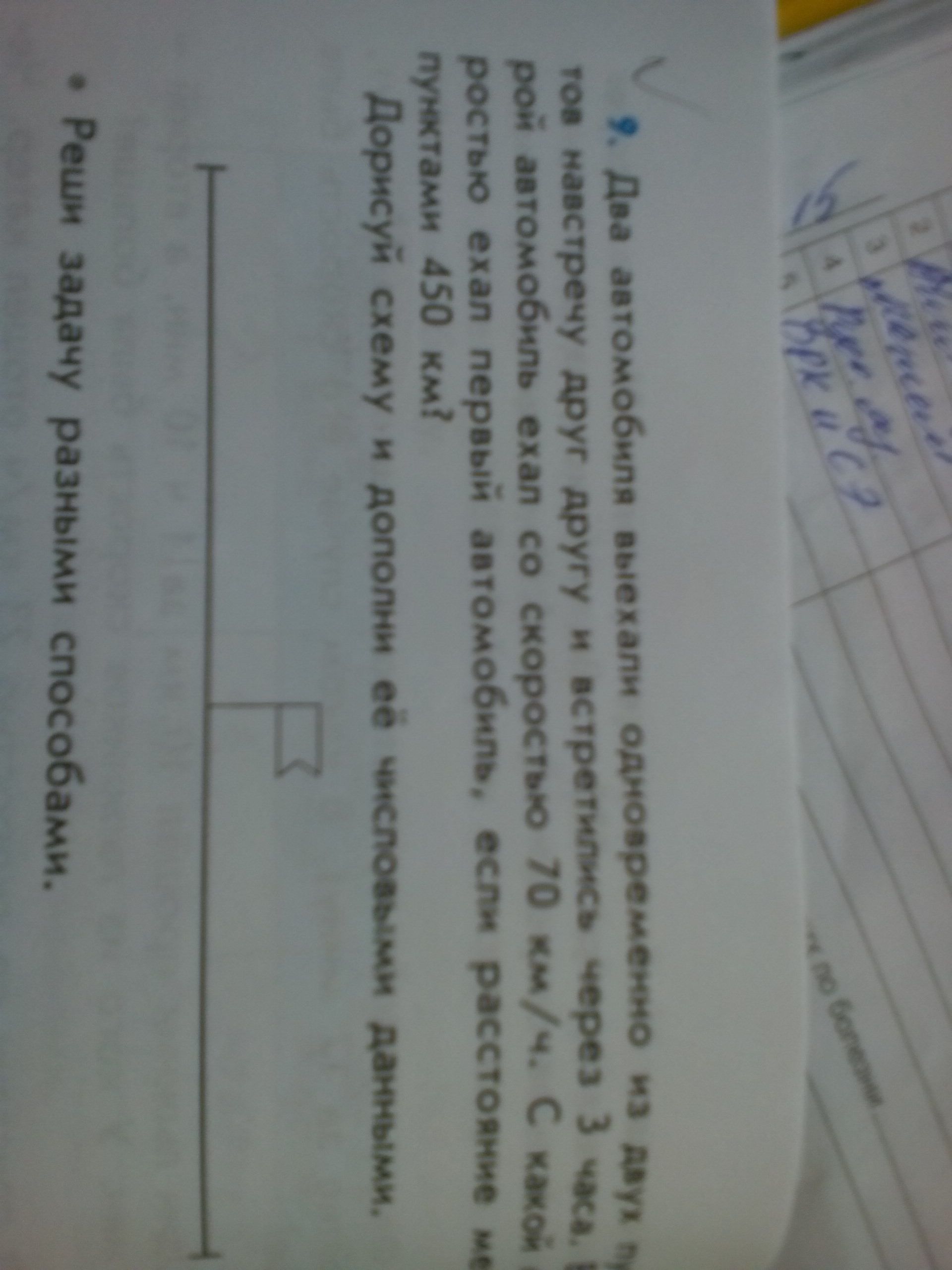 Два автомобиля выехали одновременно из двух пунктов навстречу друг другу и встретились через 3часа.Второй автомобиль ехал со скоростью 70кмч.С какой скоростью ехал первый автомобиль,если расстояние между пунктами 450км?
