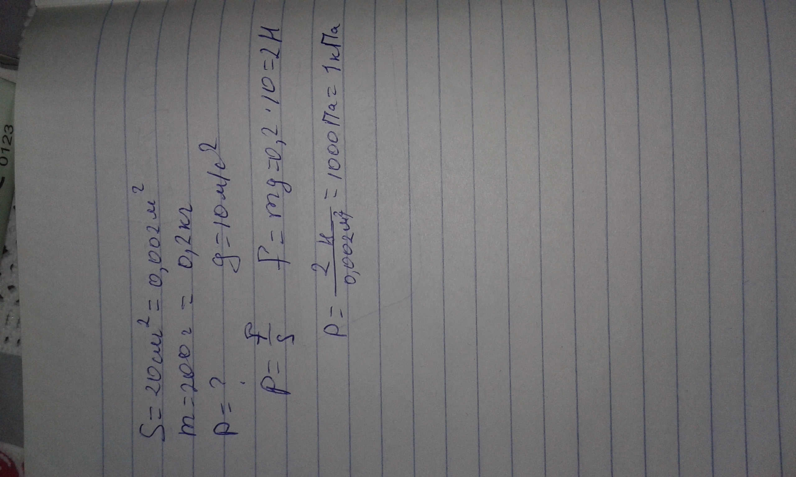 Площадь основания бруска 20см^2, масса 200г . Какое давление он оказывает на горизонтальную поверхность?