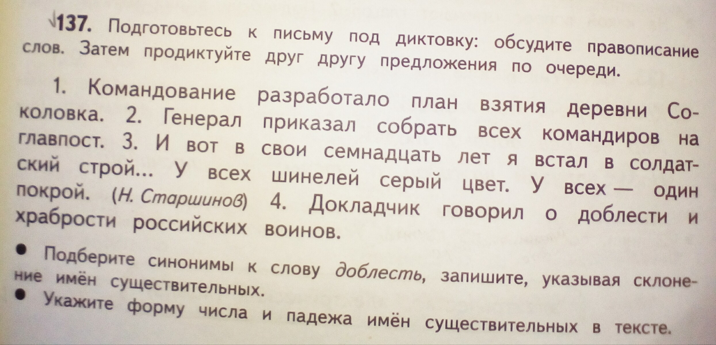 4. докладчик ( ед.ч.и.п.) говорил о доблести ( ед.ч.п.п.3-скл.) и храбрости ( ед.ч. п.п 3-скл.) российских воинов ( мн.ч. р.п.) всё!!!!!!!!!!!!!!!!!!!!!