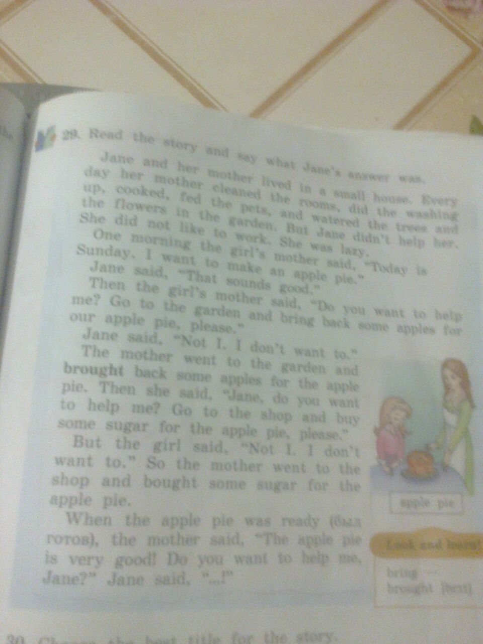 Когда яблочный пирог был готов , мать сказала: "яблочный пирог очень хорош! Ты хочешь помочь мне, Джейн" Джейн сказала, "...!"