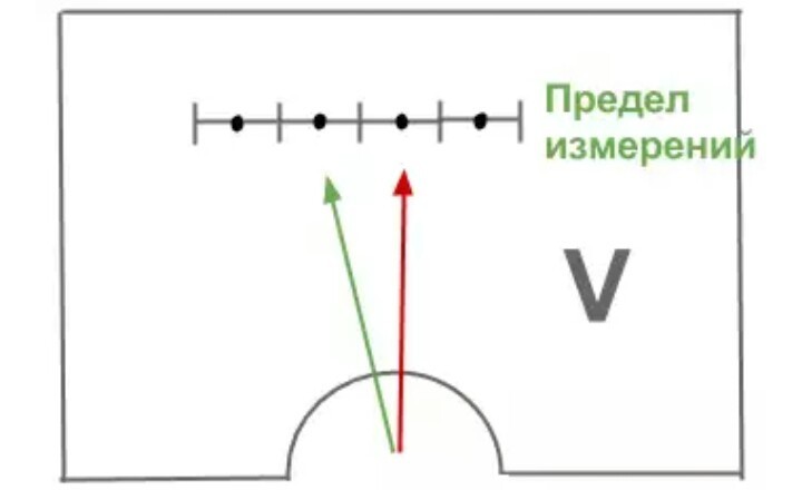 Какое электрическое напряжение соответствует показанию зелёной стрелки вольтметра, если предел измерений равен 92 В?