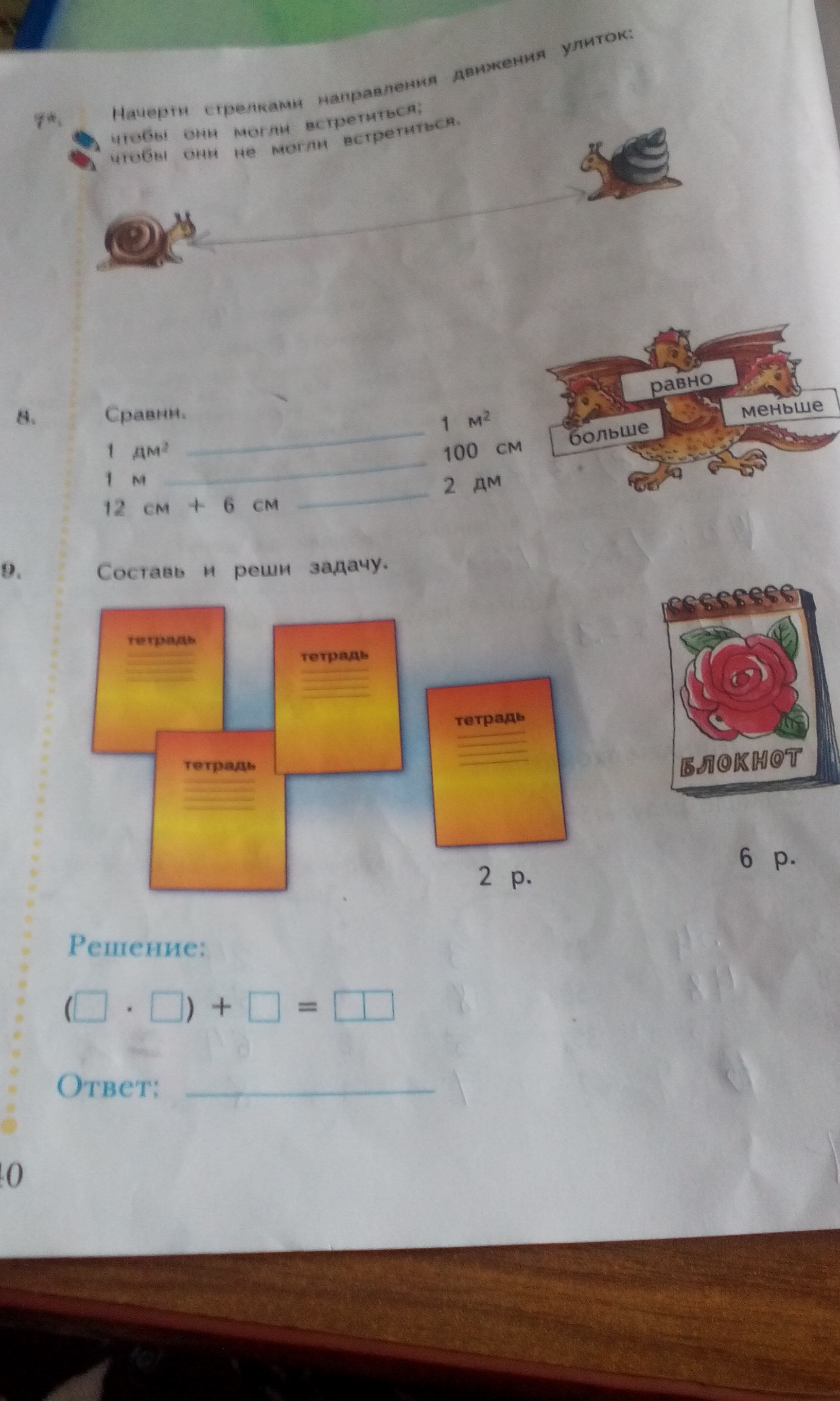 №8 1 дм² < 1 м² №9 Дима купил 4 тетради по 2 рубля и