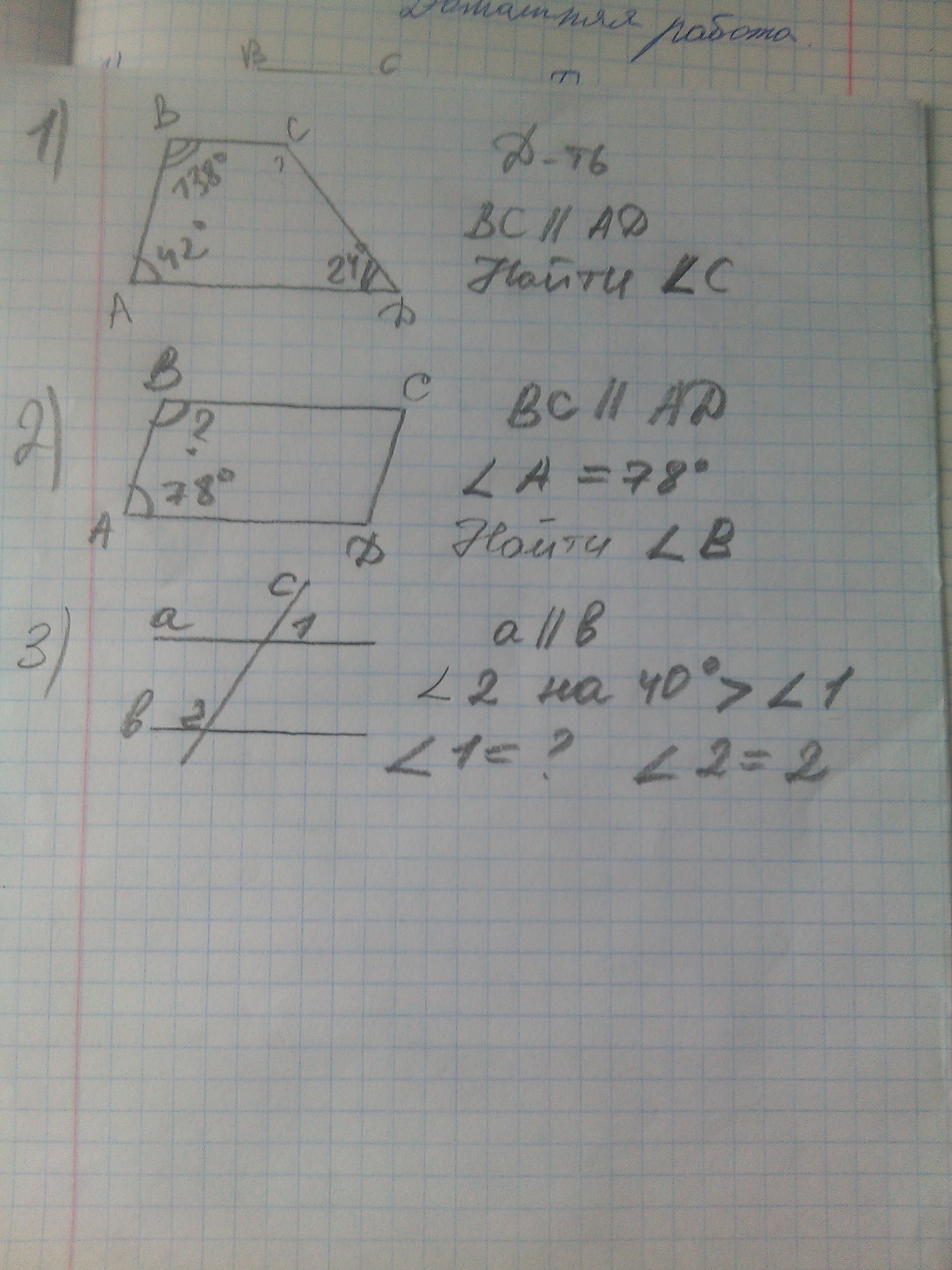 3) Пусть ∠1=х°, тогда ∠2=х°+40°. Известно, что ∠1+∠2=180°. Составляю и решаю уравнение.