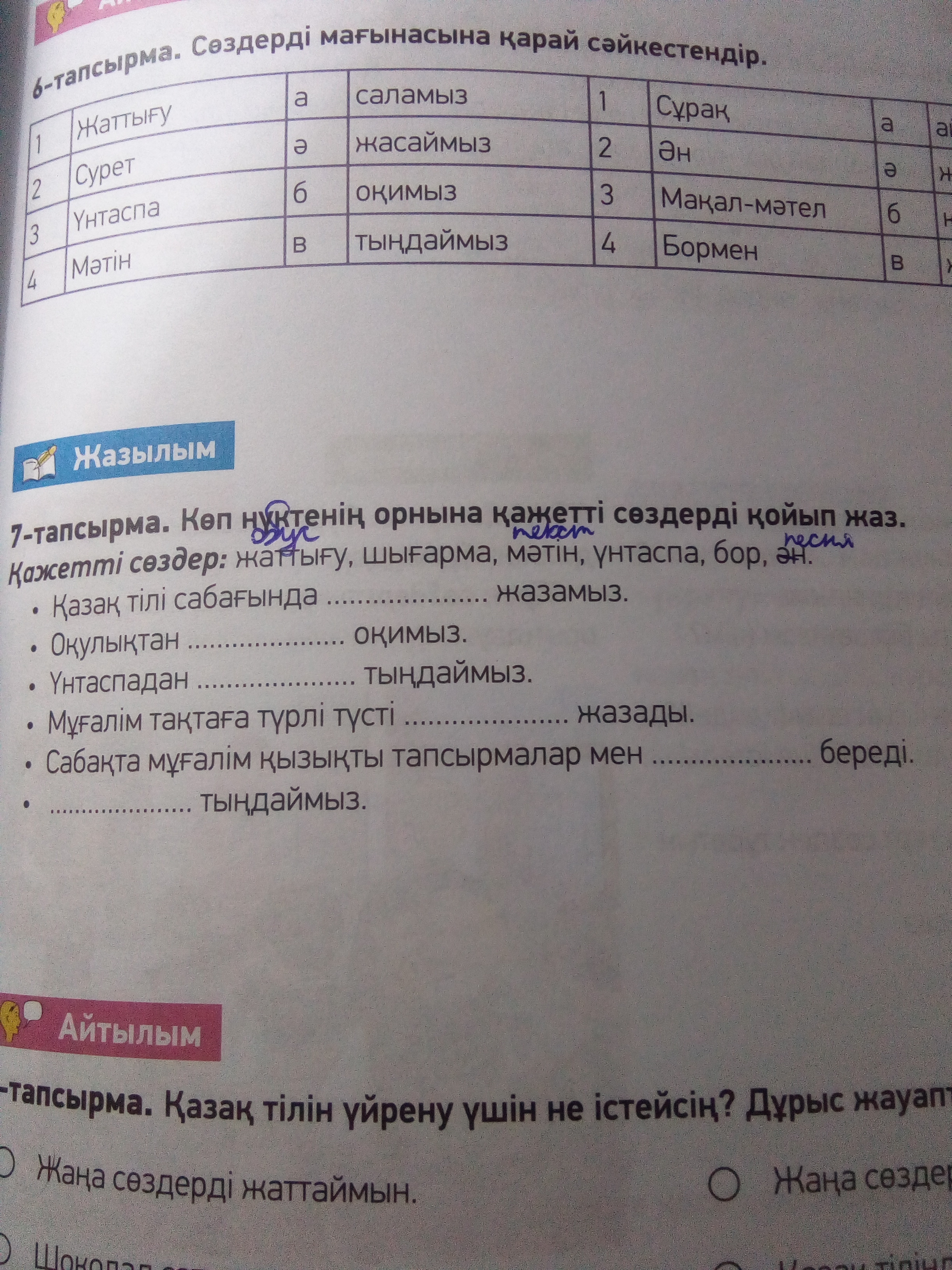 қазақ тілінде жаттығу жазамыз. оқулықтан мəтін оқимыз. Үнтаспадан əн тындаймыз. Мұғалім тақтаға түрлі- түсті бормен жазады. Сабақта мұғалім қызықты тапсырмалар мен шығарм береді. Үнтаспа тындаймыз.