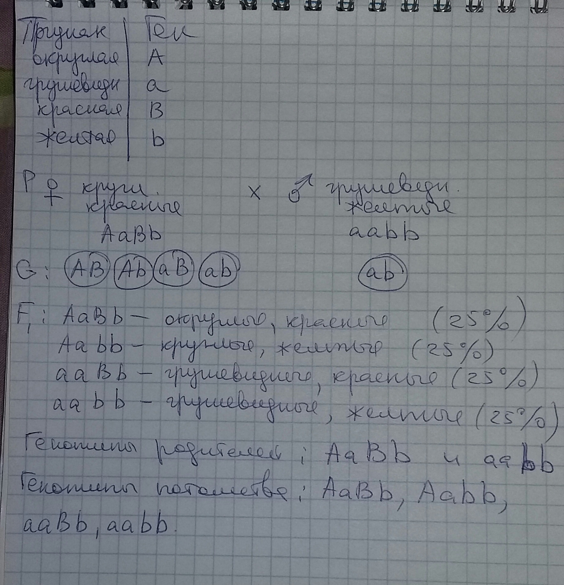 У томатов округлая форма плодов доминирует над грушевидной, а красная окраска плодов – над желтой.Растения с круглыми и красными плодами скрещены с растением имеющим грушевидные и жёлтые плоды. В потомстве 25% растений дали круглые красные плоды,25% круглые жёлтые,25% грушевидные красные,25%грушевидные жёлтые. Каковы генотипы родителей и потомства?