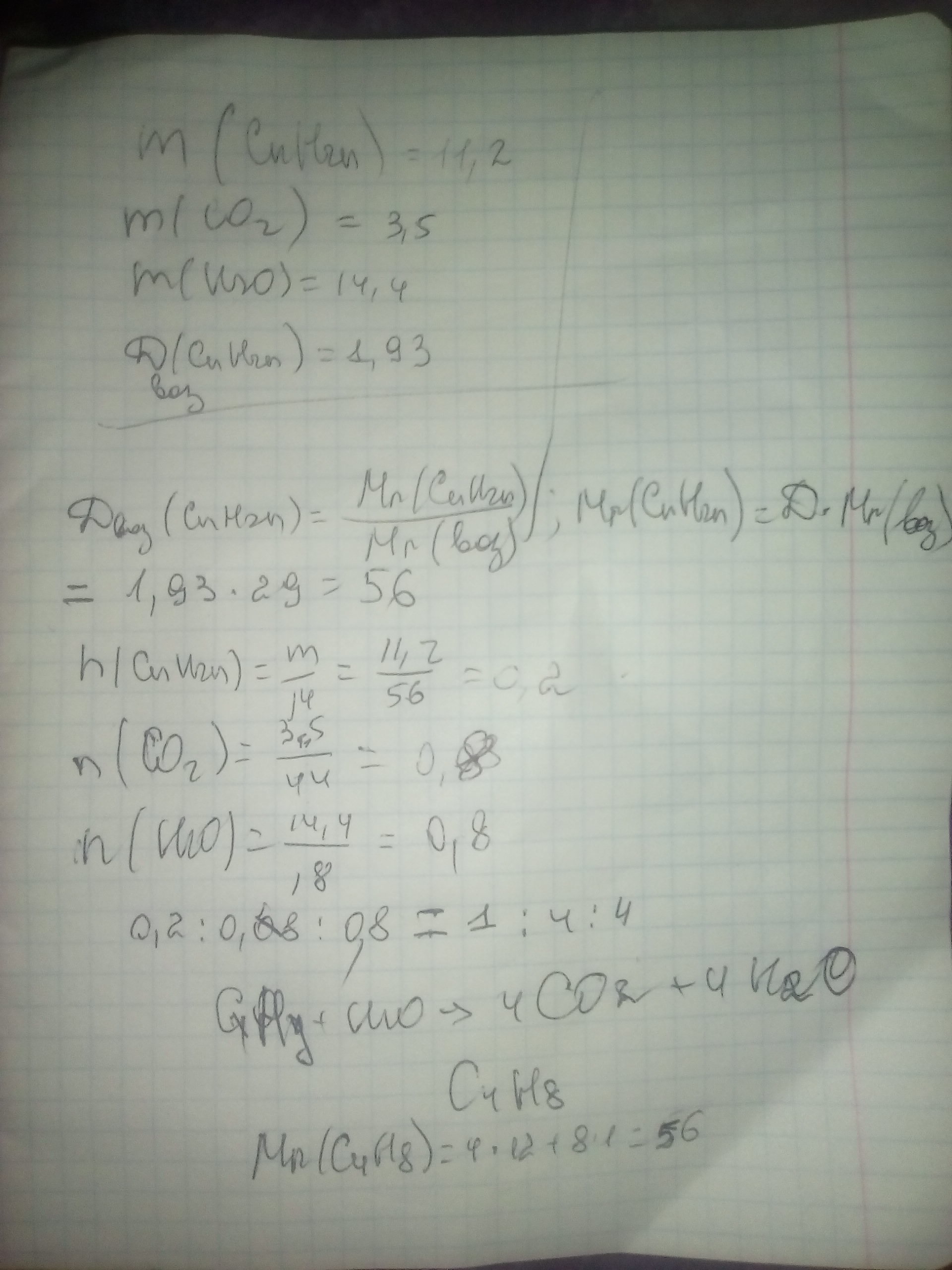 При сжигании алкена массой 11, 2 грамма получили 3, 5 грамм оксида углерода четырехвалентного и 14, 4 грамм воды. Относительная плотность алкена по воздуху 1, 93. Найдите молекулярную формулу алкена. Кому не трудно, распишите пожалуйста подробно решение со всеми формулами.