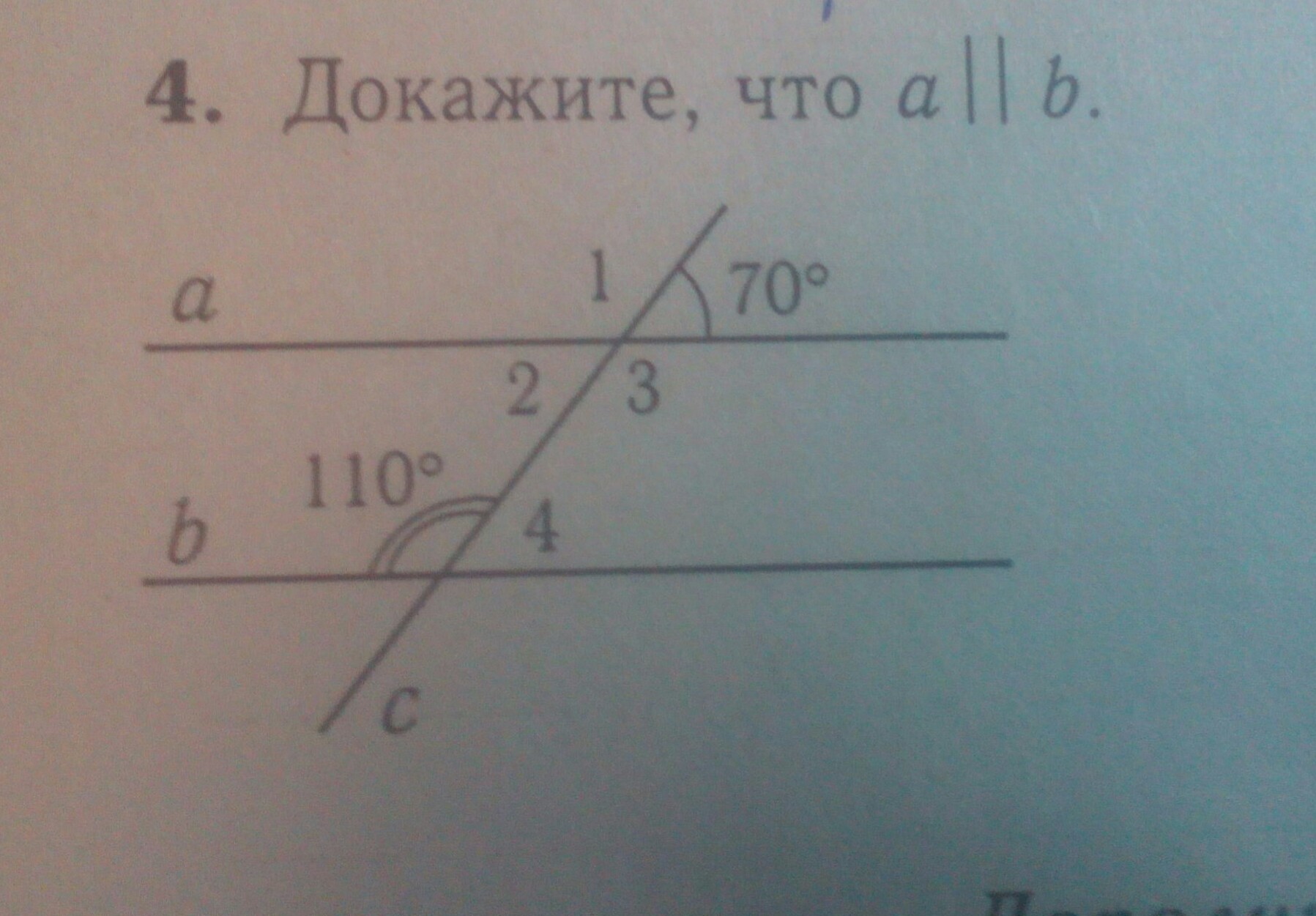 2. Угол 4 равен 70 градусов и является соответственным с другим углом, равным 70 градусов. Если соответственные углы равны, то прямые параллельны => а параллельная b при секущей с.