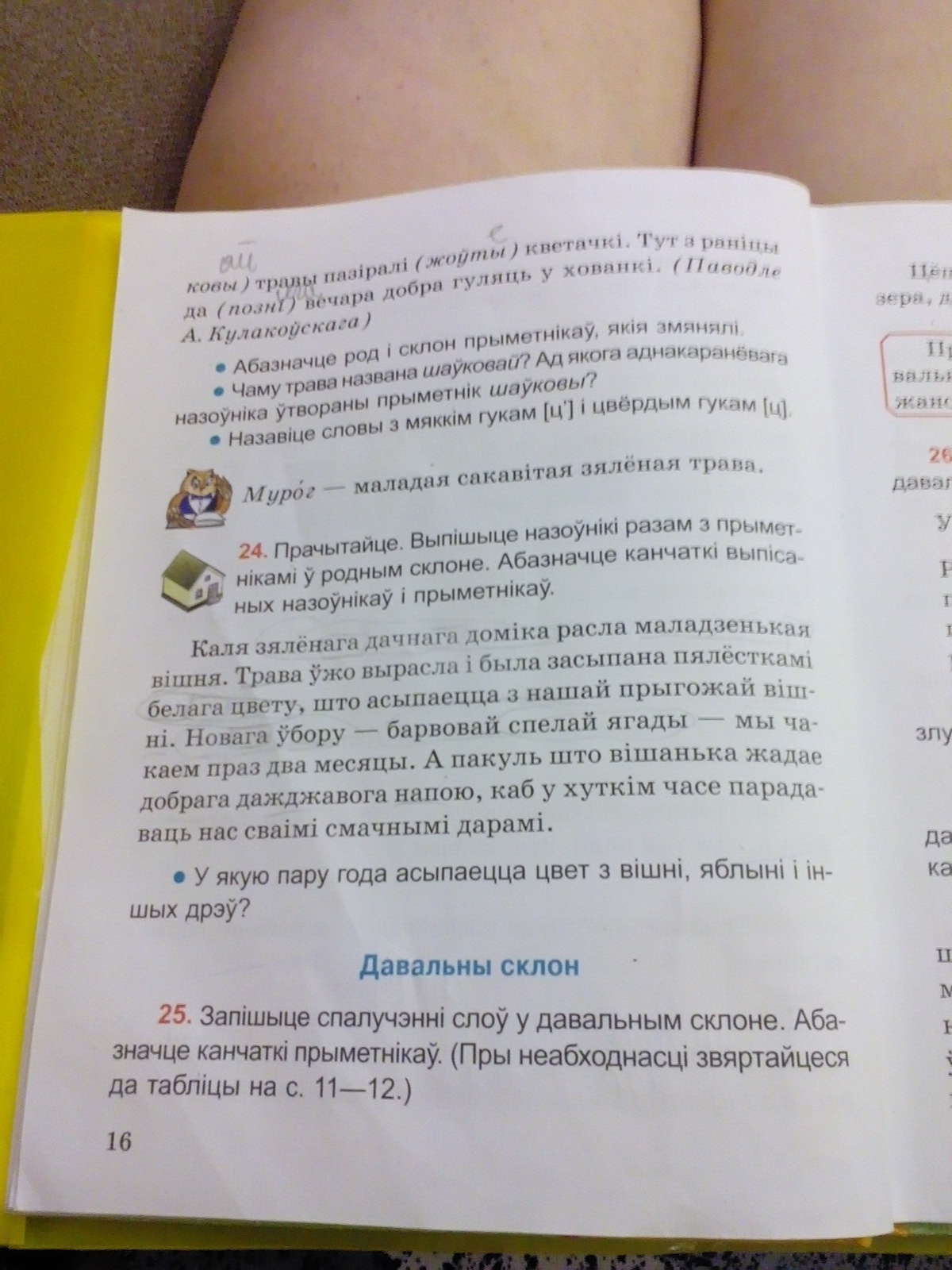 Прачытайце. Выпишыце назоуники разам з прыметниками у родным склоне. Абазначце канчатки выписаных назоуникау и прыметникау.