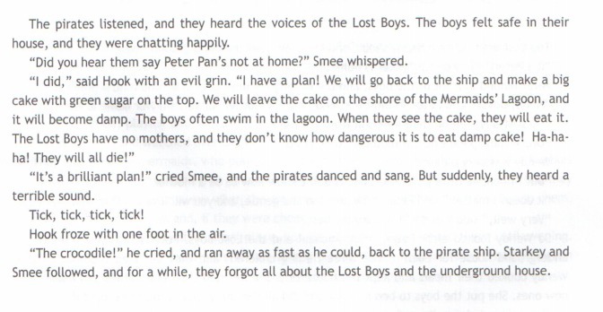 "Да, слышал", - сказал крюк со зловещей улыбкой. "У меня есть план! Мы вернемся на корабль и сделаем большой торт с зеленым сахаром на вершине. Мы оставим Торт на берегу Русалочьей лагуны, и он станет влажной. Мальчики часто плавают в лагуне. Когда они увидят торт, они съедят его. У Потерянных мальчиков нет матерей, и они не знают, что это опасно, есть сырой торт! Ха - ха - ха! Они все умрут!"