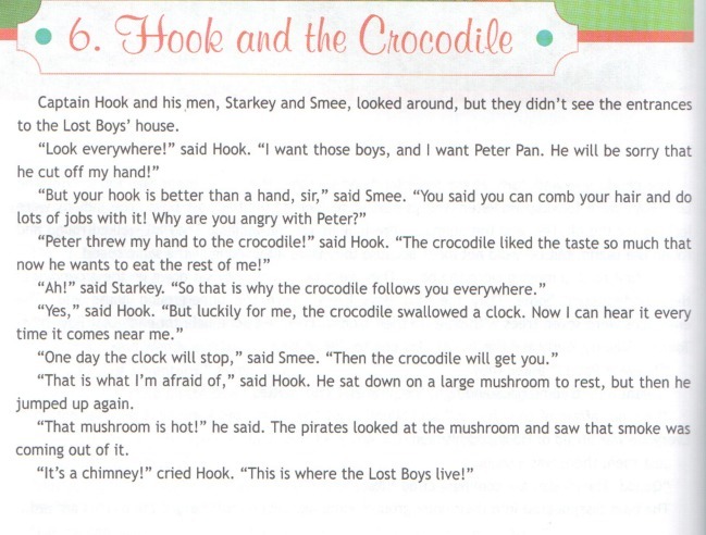 Капитан крюк и его люди, Старки и Сми, посмотрели вокруг, но они не видели входы в дом потерянных детей. "Искать повсюду!" - сказал крюк. "Я хочу этих мальчиков, и я хочу Питер Пэна. Он будет жалеть, что отрезал мою руку!" "Но крюк лучше чем рука, сэр", - сказал СМИ. "Вы сказали, что вы можете расчесывать волосы и делать остальную работу с ним! Почему ты сердишься на Питера?" "Питер скормил мою руку крокодилу!" - сказал Хук. "Крокодилу понравился вкус настолько, что теперь он хочет съесть все остальное!" "Ах!", сказал Старки. "Так вот почему крокодил следует за вами повсюду". - Да, - сказал крюк. "Но, к счастью для меня, крокодил проглотил часы. Теперь я слышу его каждый раз, когда он приближается ко мне". "Однажды часы остановятся", - сказал СМИ. "Тогда крокодил вас настигнет". "Вот чего я боюсь", - сказал крюк. Он сел на большой гриб, чтобы отдохнуть, но тут же вскакивал снова. "Гриб горячий!" сказал он. Пираты посмотрели на гриб и увидели, что из него идет дым. "Это дымоход!" - воскликнул Крюк. "Здесь живут потерянные мальчики!" Пираты прислушались, и услышали голоса потерянных мальчиков. Ребята чувствовали, что они дома и они с радостью болтали.