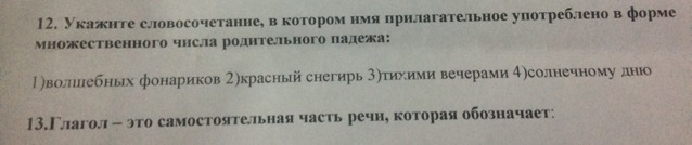 12)Укажите словосочетание, в котором имя прилагательное употреблено в форме множественного числа родительного падежа