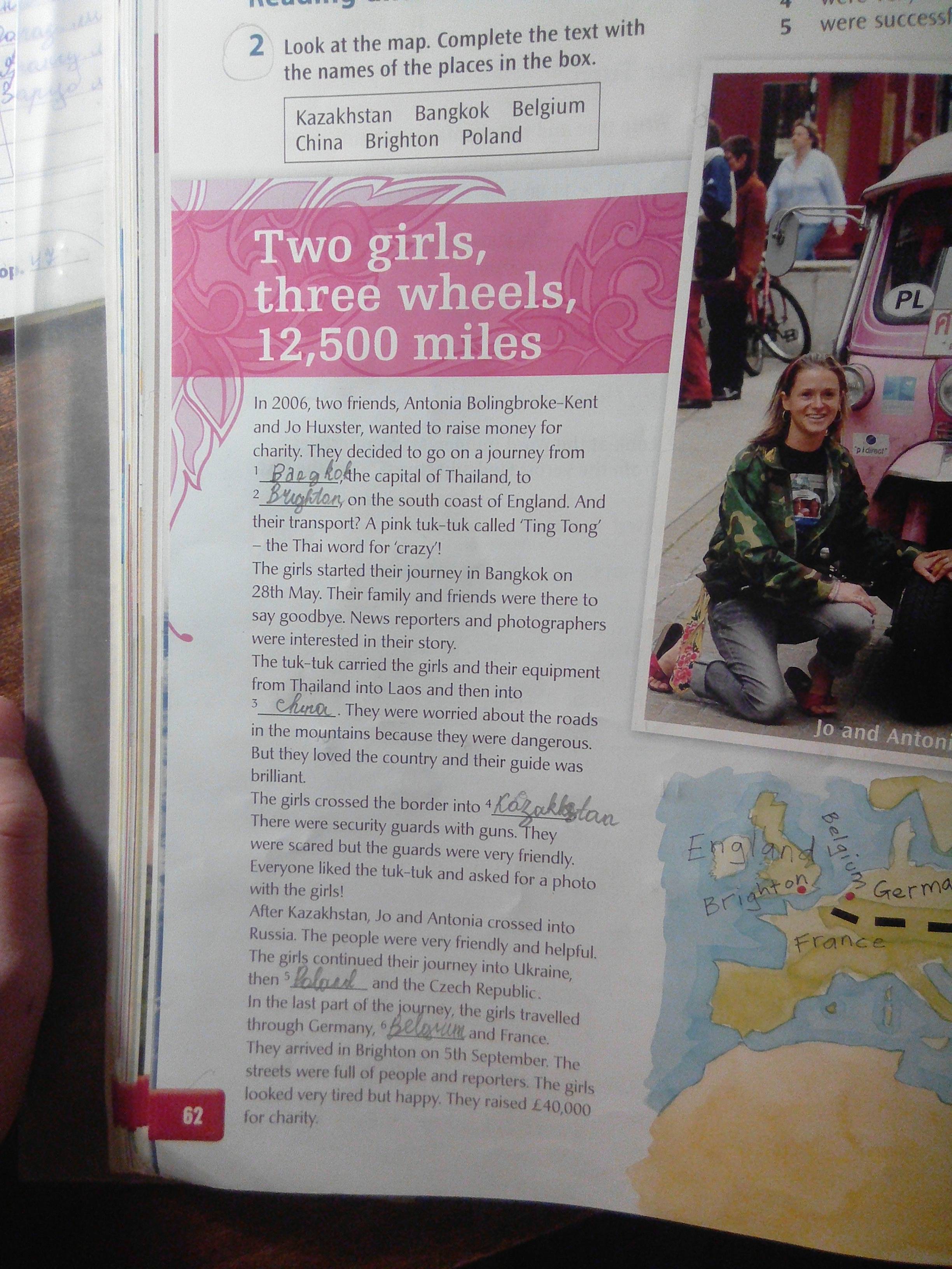 В 2006 две подруги (Джо Хакстер и Антония Булингбрук-Кент) захотели пожертвовать деньги на благотворительность. Они решили отправиться в путешествие из Бангкока, столицы Таиланда, в Брайтон, на южное побережье Англии. А их транспорт(способ передвижения)? Это розовый тук-тук(мототакси), который называется «Ting Tong» - сумасшедший с тайского языка! Девочки начали свое путешествие в Бангкоке 28-ого мая. Там же были их семьи и друзья, чтобы с ними попрощаться. Новостные репортеры и фотографы были заинтересованы в их истории. Тук-тук довез девочек и их вещи из Таиланда в Лаос, а потом и в Китай. Они волновались насчет дорог в горах, так как было опасно. Но им очень понравилась страна, и их гид(экскурсовод) был отличным. Девочки пересекли границу Казахстана. Там были охранники с оружием. Им(девочкам) ьыло страшно, но охранники были очень дружелюбными. Каждому понравился тук-тук и (каждый) просил сделать фотографию с девочками. После Казахстана Джо и Антония пересекли Россию. Люди были очень дружелюбными и полезными(готовыми помочь). Девочки продолжили свое путешествие в Украину, затем в Беларусь и Чехию. В завершающей части своего путешествия девочки направились в Германию, Бельгию и Францию. Они прибыли в Брайтон 5-ого сентября. Улицы были переполнены людьми и репортерами. Девочки выглядели очень усталыми, но счастливыми. Они пожертвовали 40 тысяч фунтов на благотворительность.