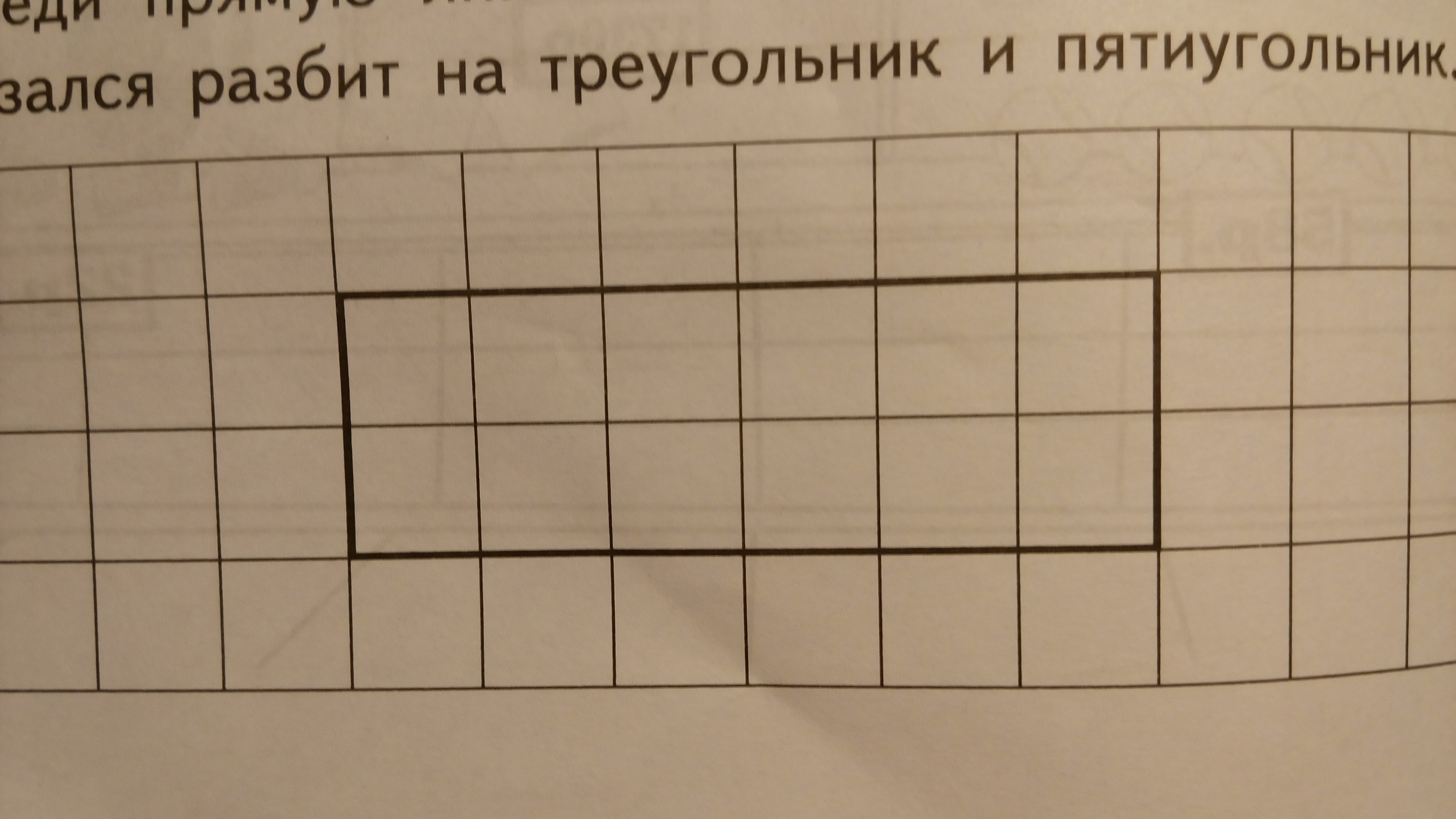 проведи линию так ,что данный прямоугольник оказался разбит на треугольник и пятиугольник