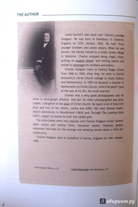 Настоящее имя Льюиса Кэролла было Чарльз Лютвиг Додгсон. Он родился в Дарсбери в Чешире, Англия 27 Января 1832 года. У него было 3 младших братьев и 7 сестер. Когда ему было 11, семья переселилась в маленькую, одинокую деревню в Йоркшире. Чарльзу нравилось делать фокусы, это было ясно исходя из того, что тот устраивал кукольные спектакли, писал поэмы и истории, чтобы развлечь своих братьев и сестер.