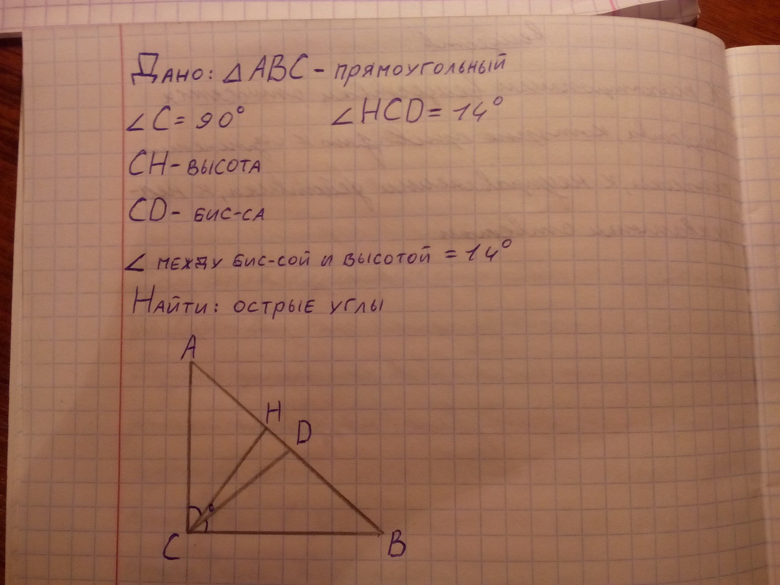 Сначала найдем чему равен угол ACH он равен (90-14)/2=38
