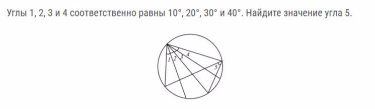 Углы 1, 2, 3 и 4 соответственно равны 10°, 20°, 30° и 40°. Найдите значение угла 5.