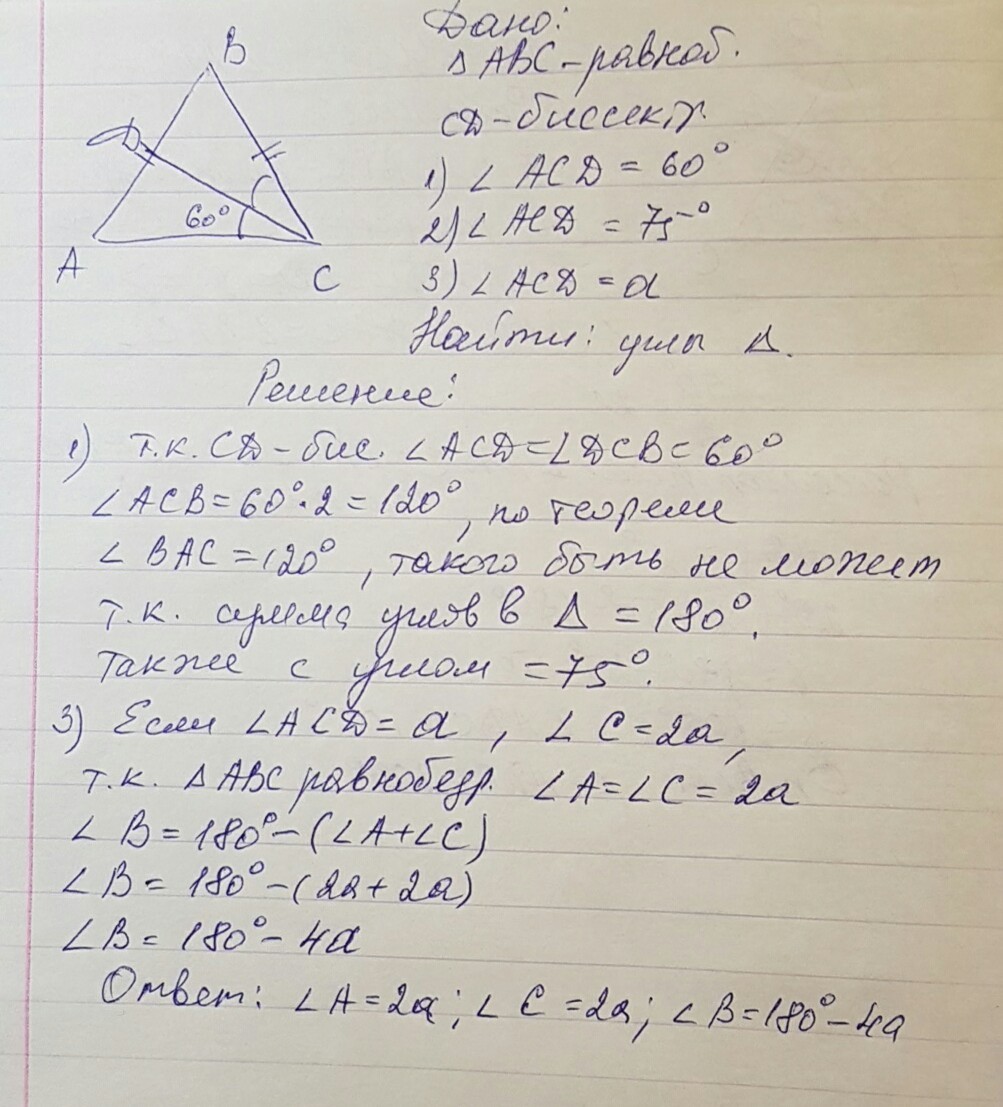В равнобедренном треугольнике ABC с основанием AC проведена биссектриса CD. Найдите углы треугольника ABC, если угол ACD равен: 60;75;а.