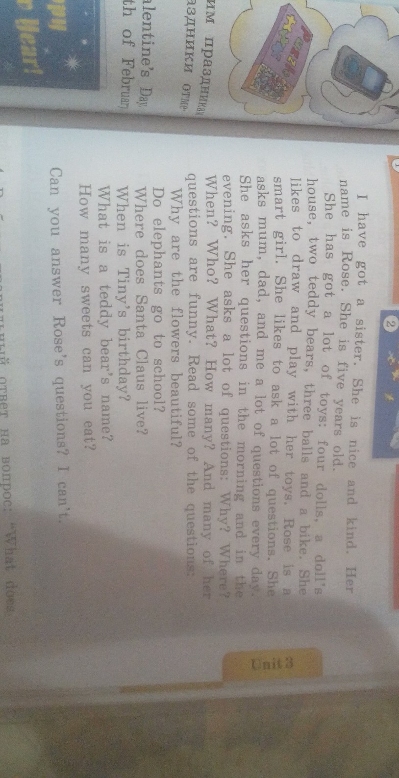 У меня есть сестра. Она милая и добрая. Её зовут Роза, ей 5 лет. У неё есть много игрушек : 4 куклы, кукольный домик, 2 медвежонка Тедди, 3 мячика и байк. Она любит рисовать и играть со своими игрушками. Роза умная девочка. Она любит задавать много вопросов каждый день. Она спрашивает вопросы утром и вечером. Она задаёт много вопросов : почему? Где? Когда? Кто? Что? Как много? И многие из её вопросов весёлые. Прочитайте некоторые из вопросов :