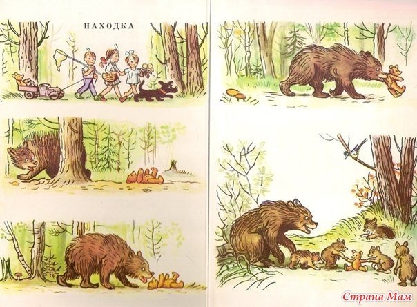 Однажды отправились дети в лес за грибами и ягодами. Взяли с собой большие корзинки, тележку и плюшевого медвежонка. Весь день они наслаждались времяпровождением в лесу, пока не решили отправиться домой. Плюшевый мишка, смирно сидящий в тележке, на очередной ямке наклонился и вывалился на землю. Дети не заметили этого и продолжили путь домой. Время шло, за мишкой не возвращались. Он уже и не надеялся вновь обрести свой дом, пока из-за деревьев не появилась большая медведица. Она подошла к плюшевому медвежонку и начала его изучать. "Какой ты странный и такой похожий на нас, медведей!"-подумала она. И решила, что не оставит его одного. Она взяла его в свою мощную пасть и понесла в свою берлогу. Там ее ожидали пятеро ее медвежат, которые с радостными воплями встретили мать и доброжелательно приняли нового члена своей семьи. Жили они долго и счастливо.