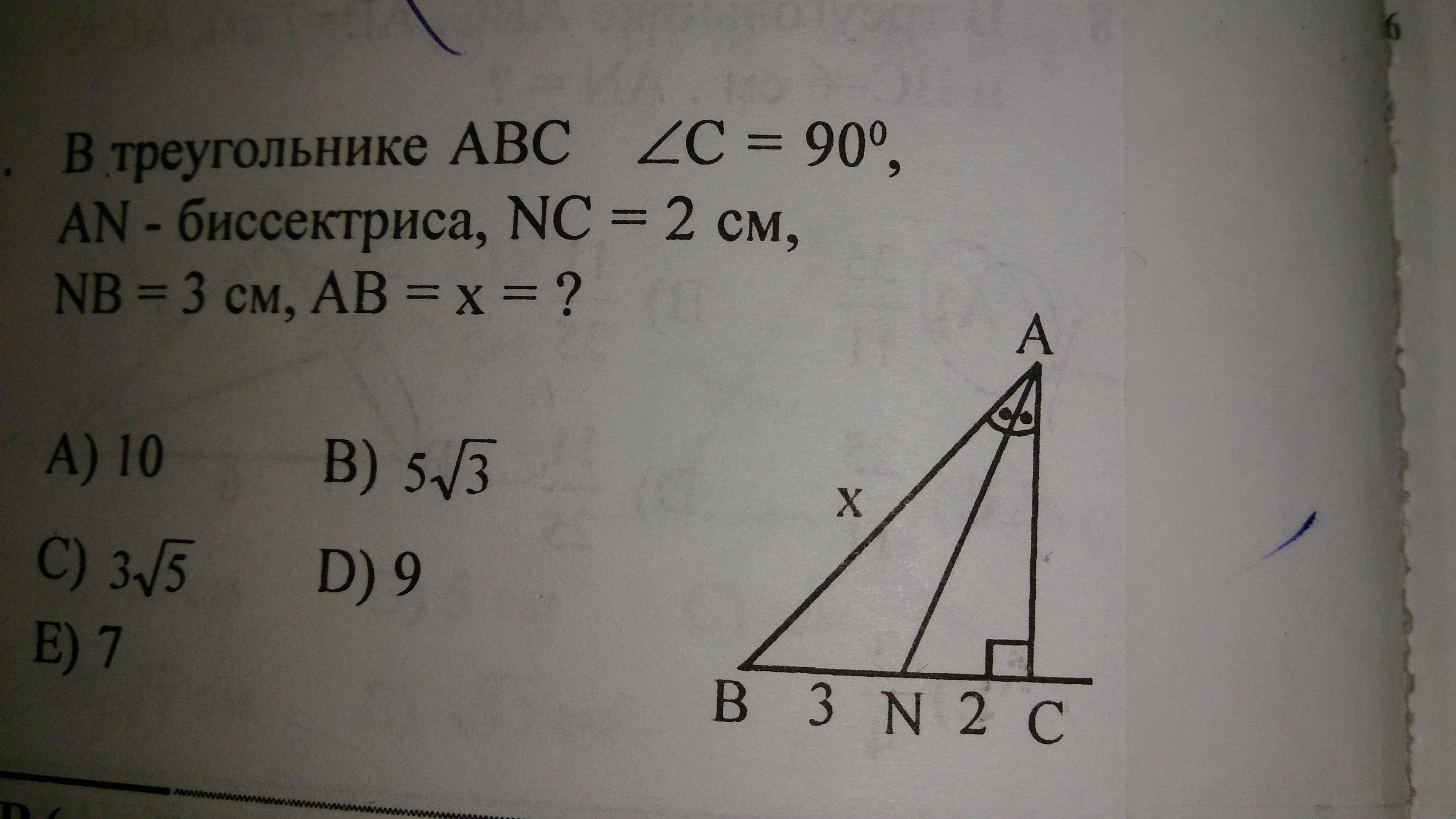 в треугольнике АВС угол С=90, АN - биссектриса, NС=2см, NВ=3см, АВ=х=?