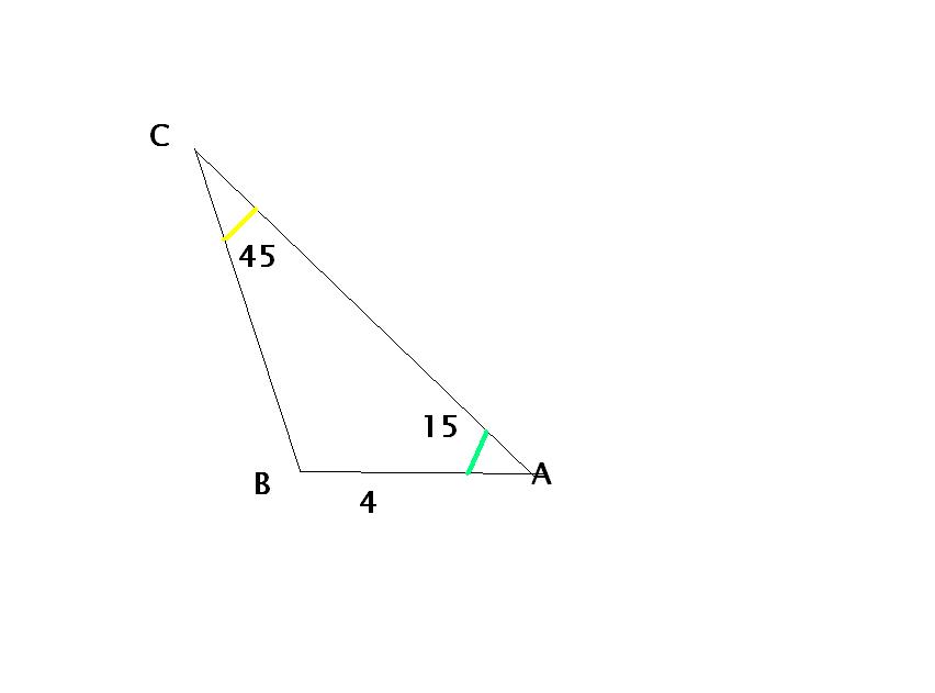 В треугольнике ABC,AB=4 см,угол C=45 градусов,угол A=15 градусов Найти сторону AC.