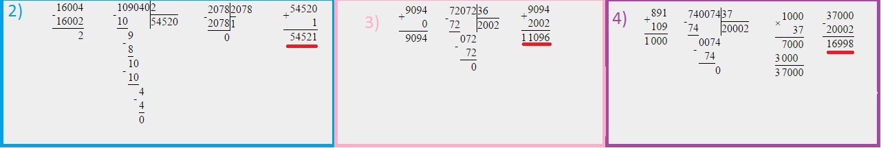 найди значения выражений. 2) 109040/(16004-16002)+2078/2078= 3) 9094+0/523920-72072/36= 4) (891+109)*37-740074/37= всё сделать в стобик
