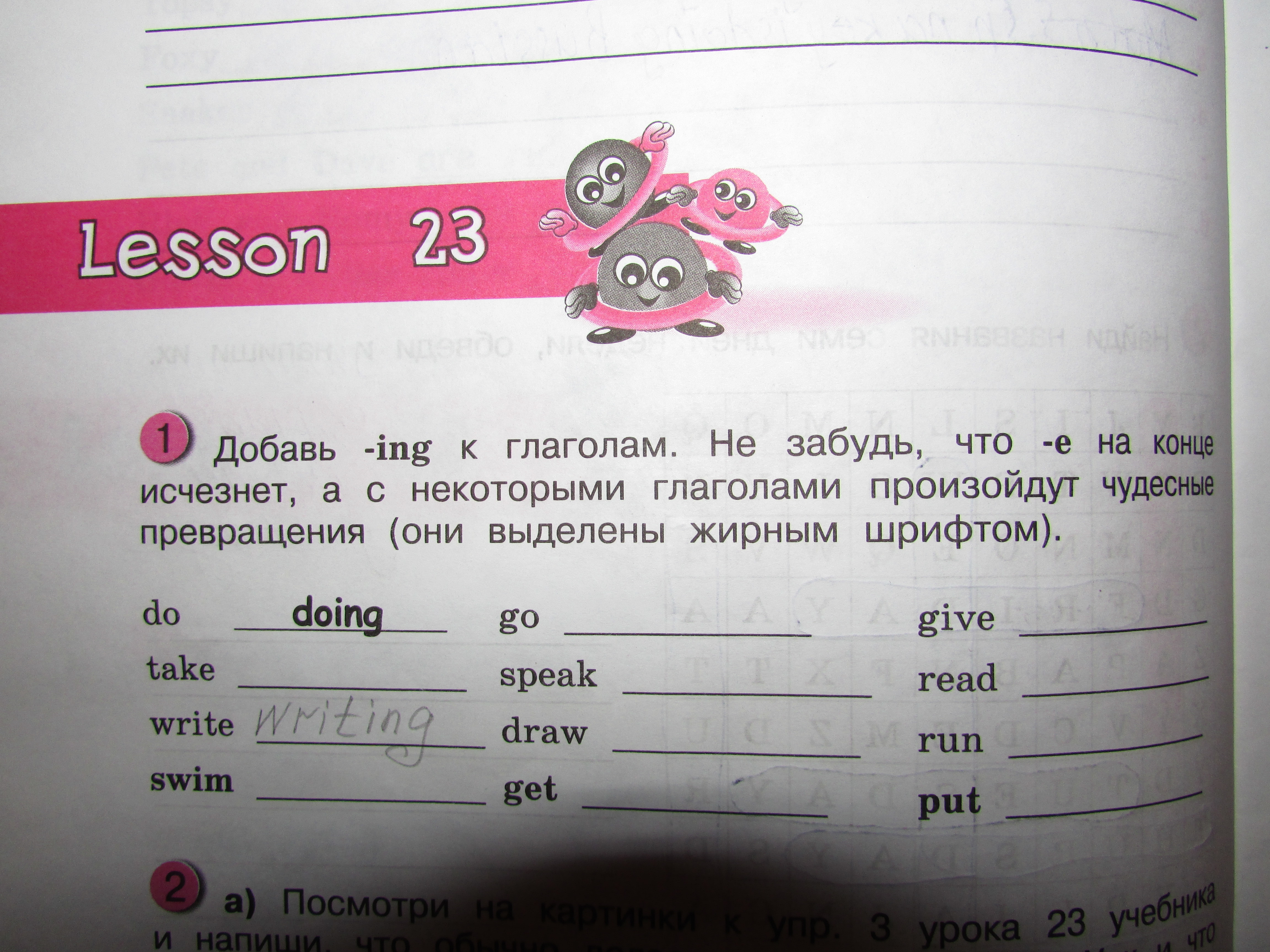 Taking,writing,swimming,going,speaking,drawing,getting,giving,reading,running,putting.