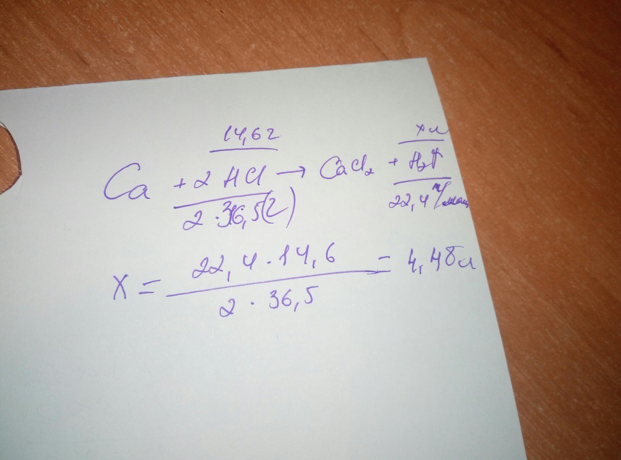 Обчисли який об'є водню (н.у.) утворюється при взаємодії з кальцію з хлоридною кислотою HCl масою 14, 6 Г?