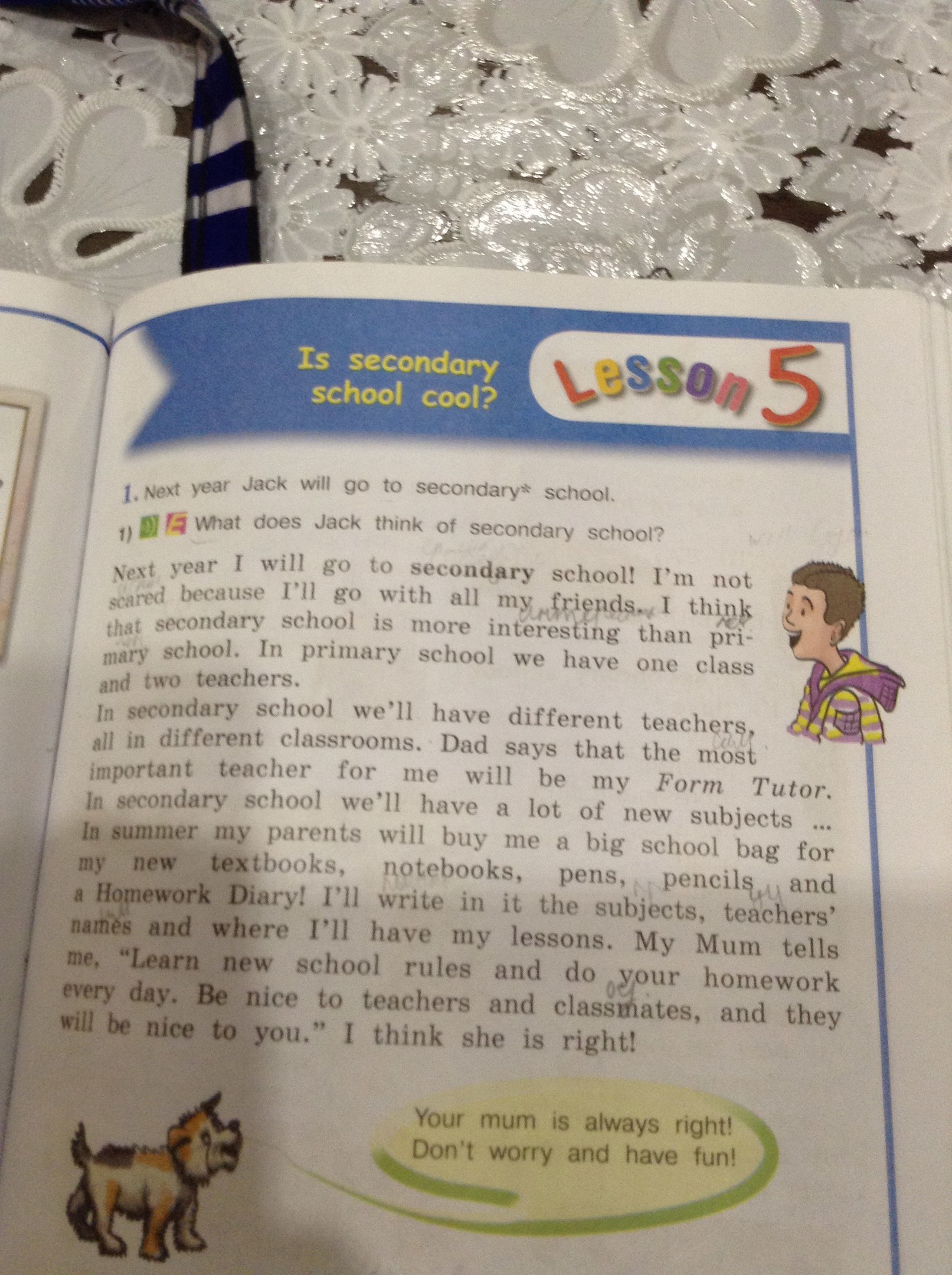 Джек пойдет в среднюю школу. 1. В следующем году Умиа Что Джек думать о средней школе? В следующем году я пойду в среднюю школу! Я не потому, что шляпа вторичный я пойду с друзьями. Школа является более интересным, чем школы. В начальной школе у нас есть один класс и два учителя В школе мы будем получать разные учителей в разных классах. Папа говорит, что главным учителем для меня будет моя форма Tutor. В средней школе у нас будет много новых предметов Летом мои родители будут покупать мне большую школьную сумку для моего нового учебники, тетради, ручки, карандаш домашнее задание Дневник! Я буду писать в нем имена и предметы, меня, "Познай, где я буду иметь мои уроки. Моя мама говорит каждый день. Правила новой школы и делать свою домашнюю работу будет Быть хорошим учителей и одноклассников, и они хорошо к вам ". Я думаю, что она права! Ваша мама всегда прав Не волнуйтесь и имеют FUNT