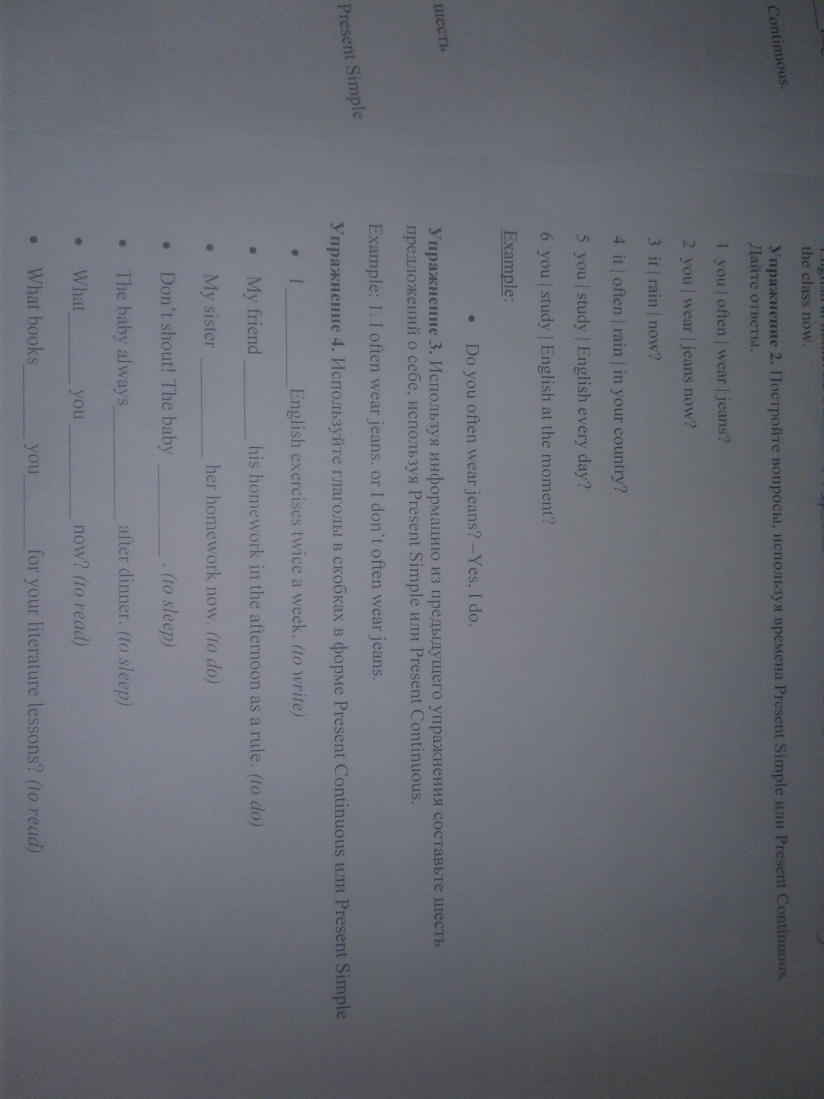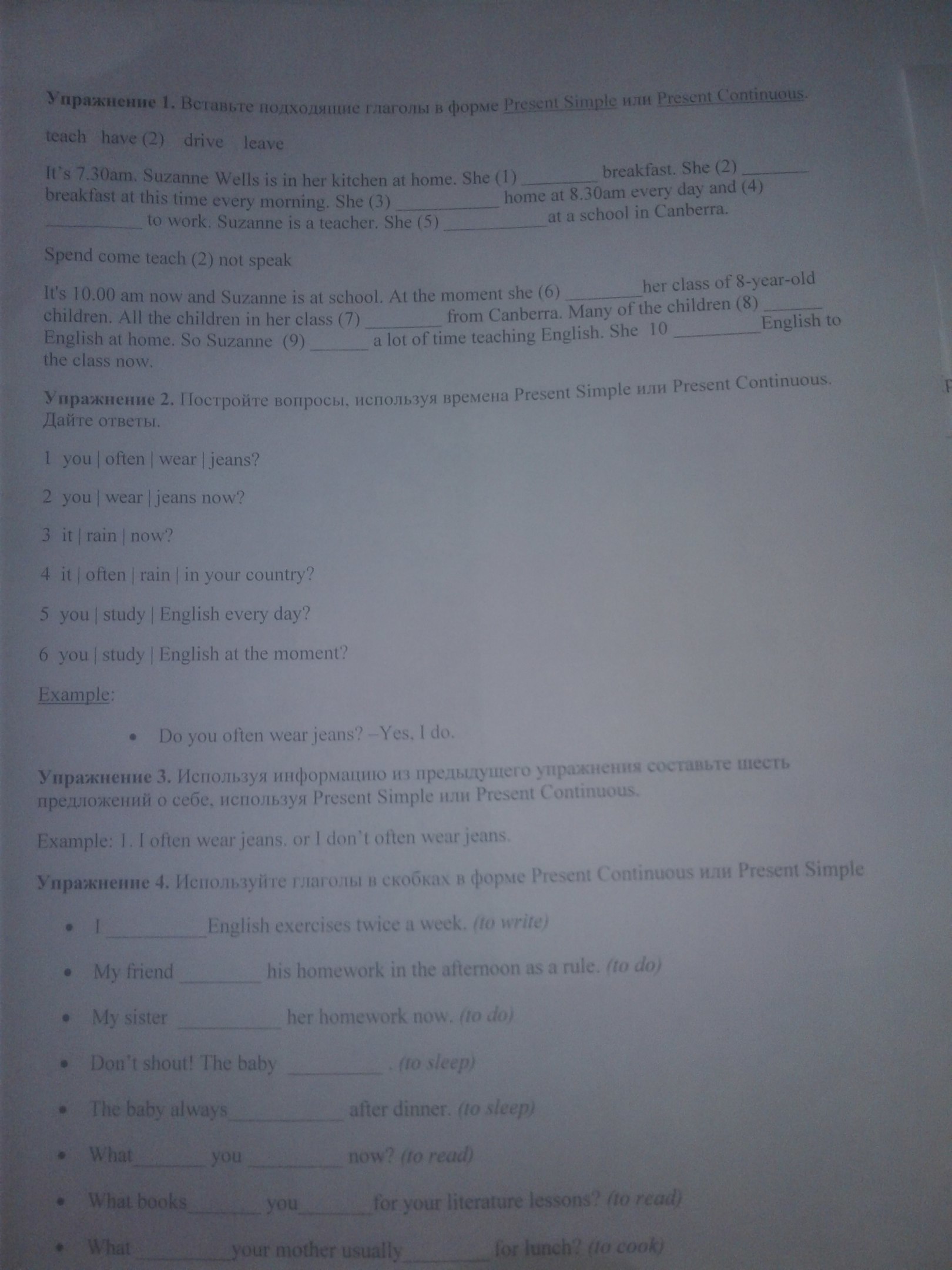 I often wear dresses.Now I am wearing blue jeans.I study every day.At the moment I am studying.It is not raining now.It sometimes rains in Russia.